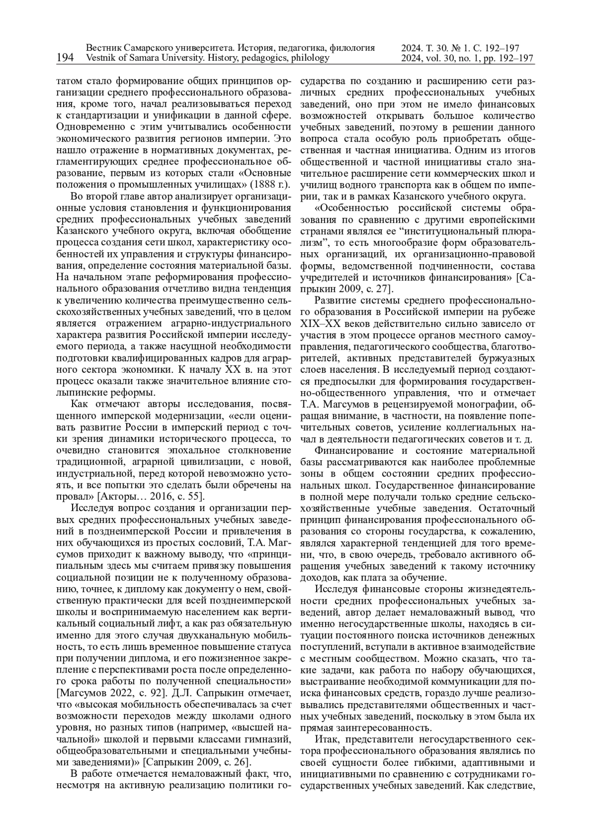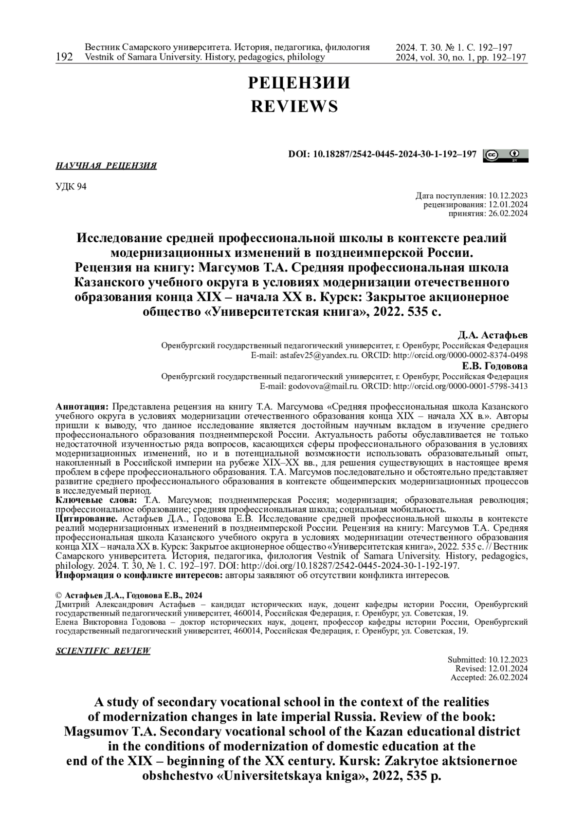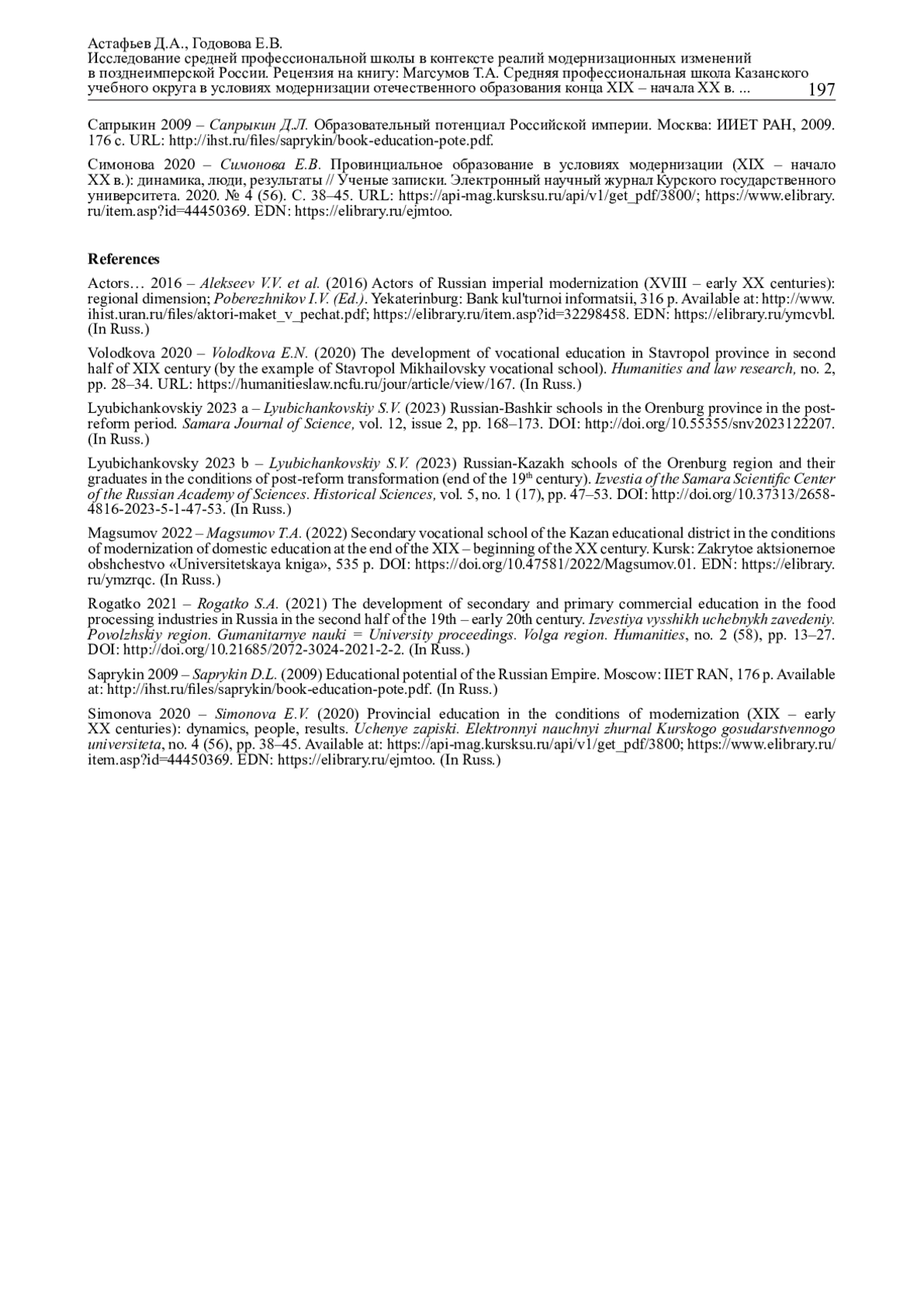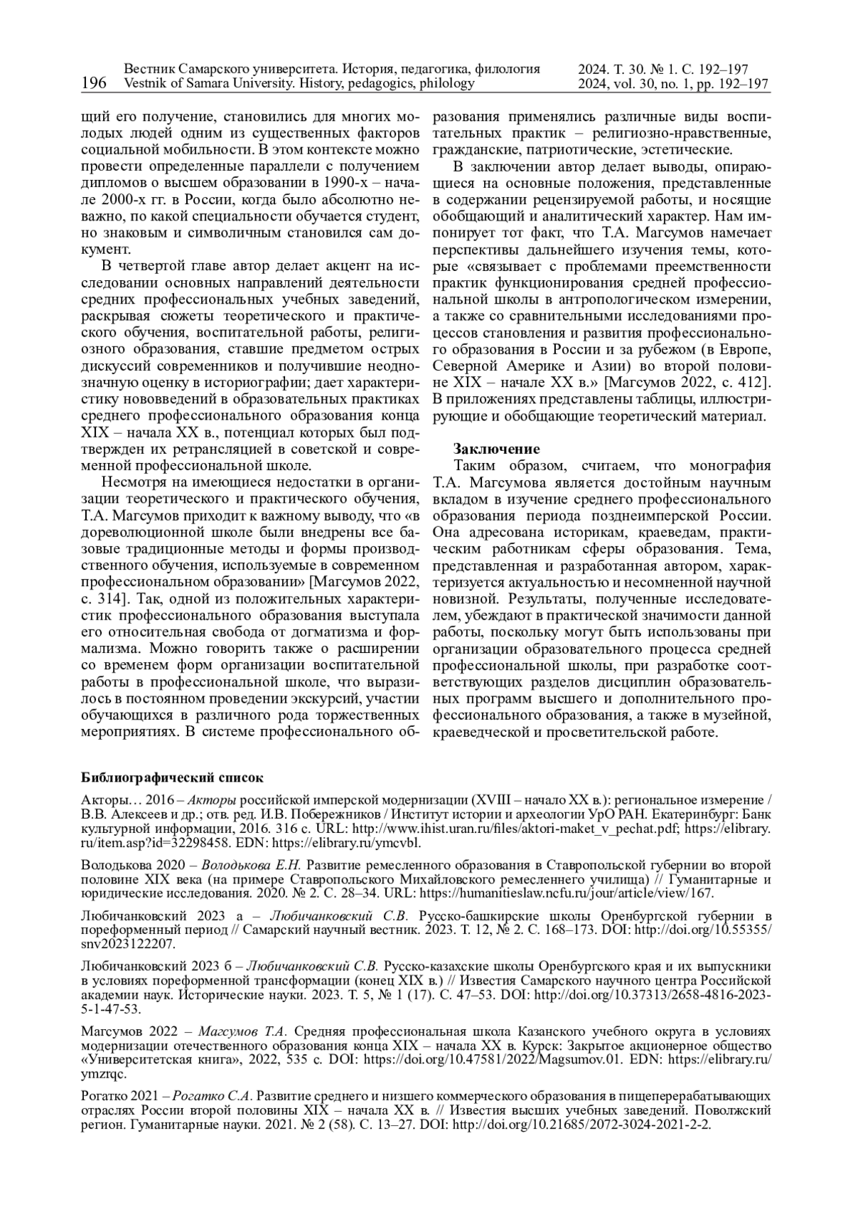 5. Магсумов 2022 - Магсумов Т.А. Средняя профессиональная школа Казанского учебного округа в условиях модернизации отечественного образования конца XIX - начала XX в. Курск: Закрытое акционерное общество “Университетская книга”, 2022, 535 с. DOI: 10.47581/2022/Magsumov.01 EDN: YMZRQC