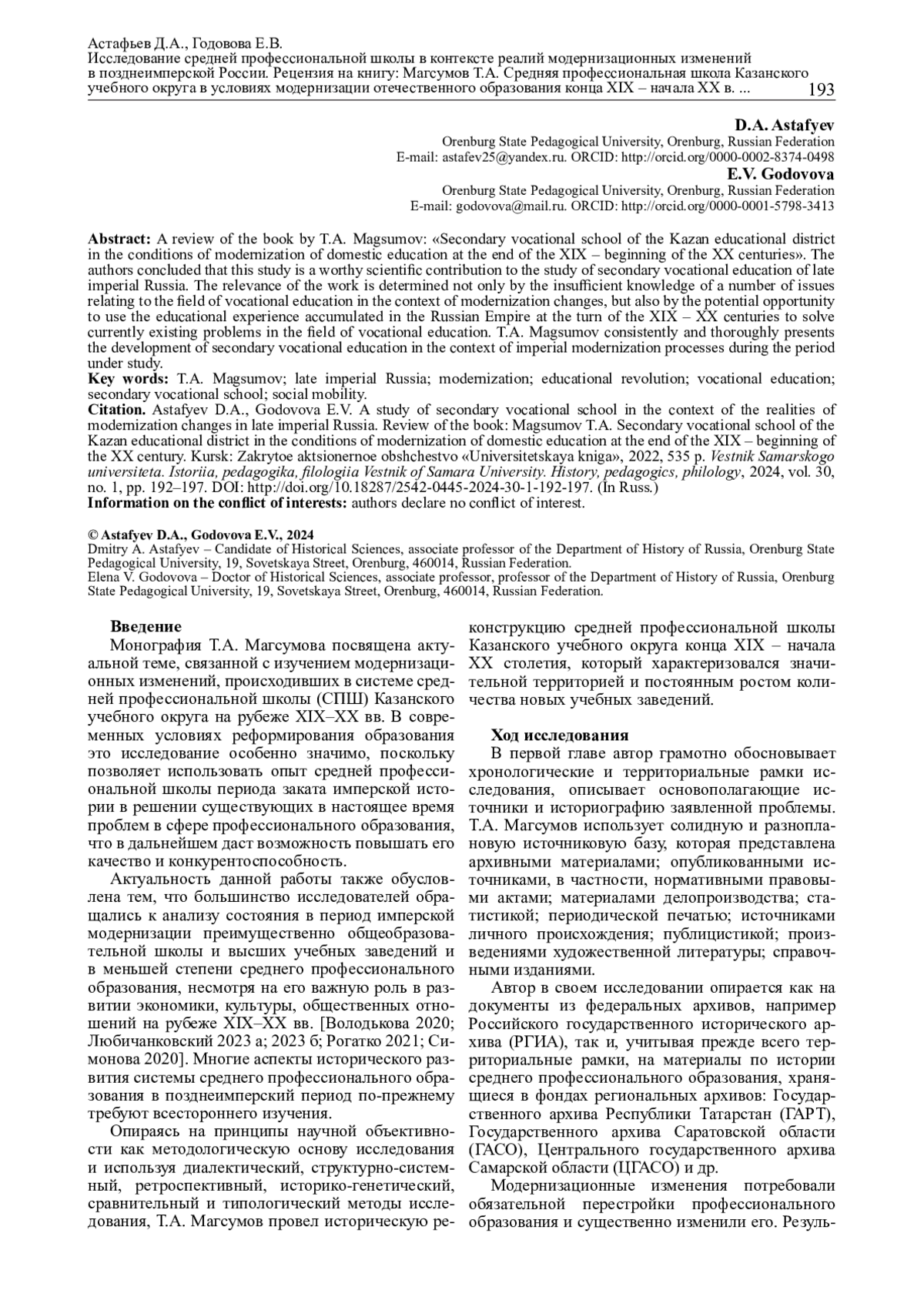 8. Симонова 2020 - Симонова Е.В. Провинциальное образование в условиях модернизации (XIX - начало ХХ в.): динамика, люди, результаты // Ученые записки. Электронный научный журнал Курского государственного университета. 2020. № 4 (56). С. 38-45. URL: https://api-mag.kursksu.ru/api/v1/get_pdf/3800/; item.asp?id=44450369. EDN: EJMTOO
