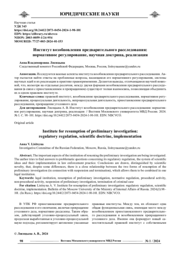 Исследуются важные аспекты института возобновления предварительного расследования. Автор пытается найти ответы на проблемные вопросы, касающиеся его нормативного регулирования, системы научных идей и их реализации в практике правоприменении. Делаются выводы, отличающиеся научной новизной, что, несмотря на отдельные различия, между двумя формами возобновления предварительного расследования (в связи с приостановлением и прекращением) существует тесная взаимосвязь, позволяющая объединить их в одном правовом институте.