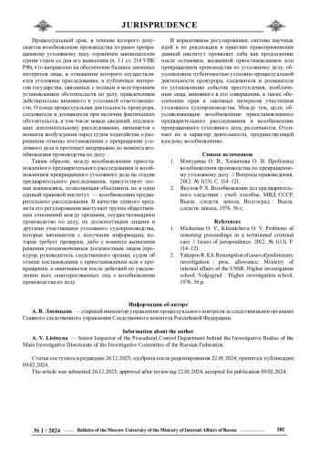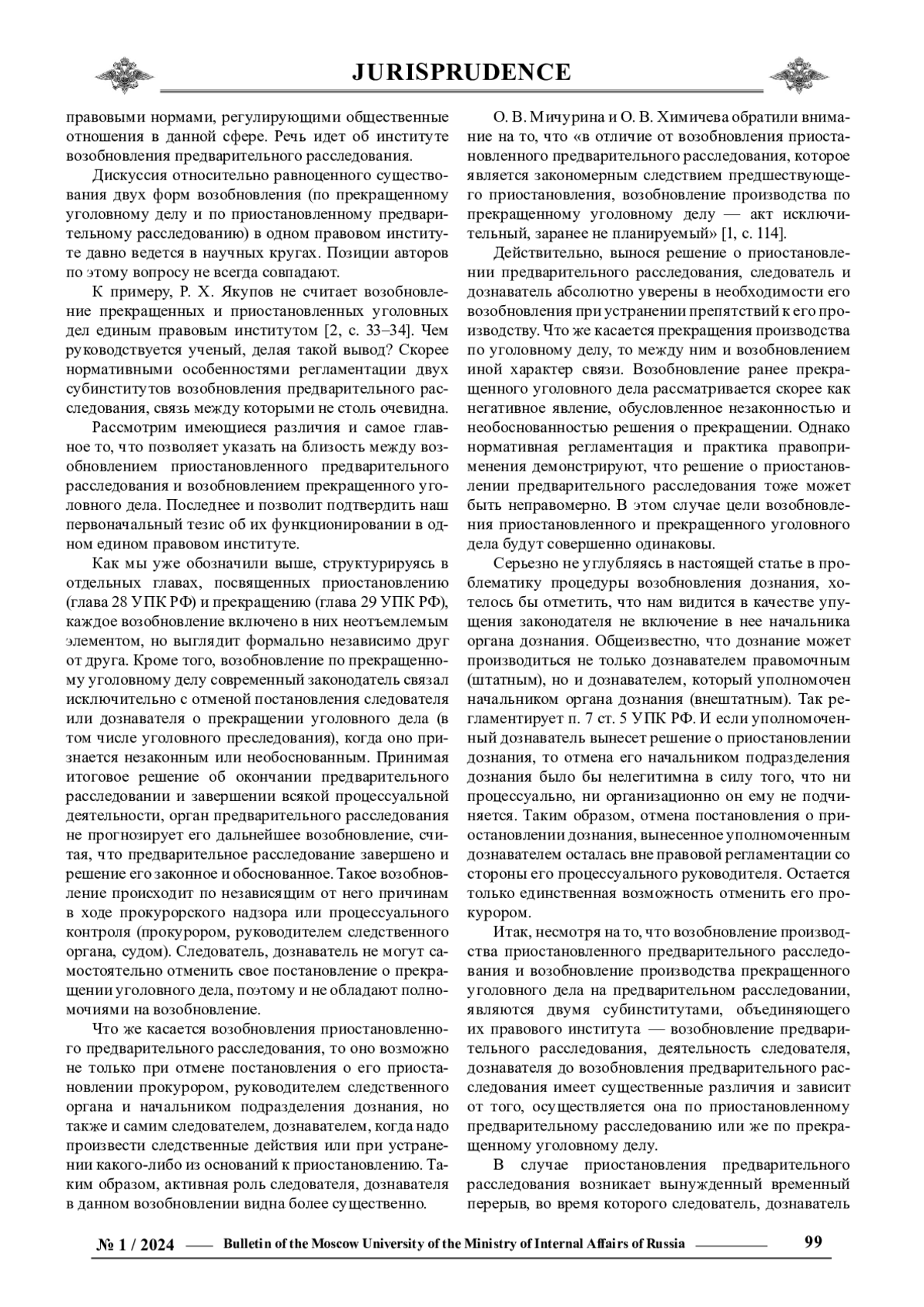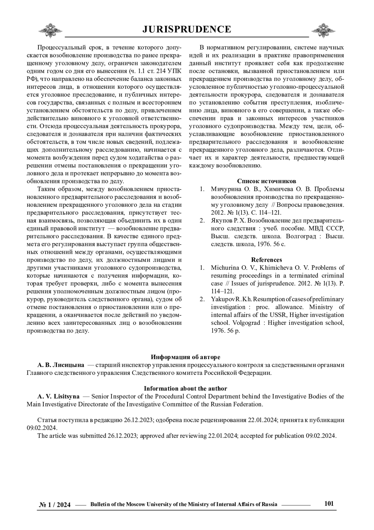 1. Мичурина О. В., Химичева О. В. Проблемы возобновления производства по прекращенному уголовному делу // Вопросы правоведения. 2012. № 1(13). С. 114-121. EDN: OXDKVD