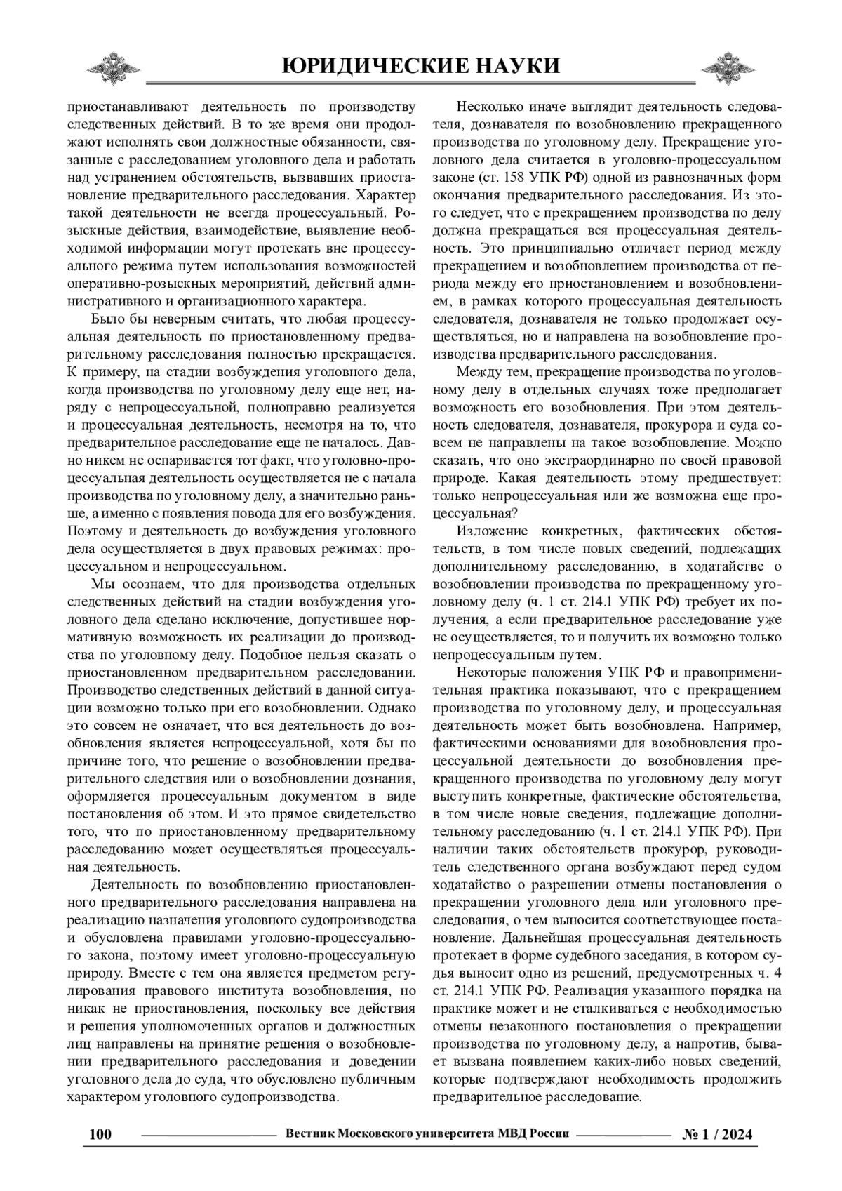 Мы осознаем, что для производства отдельных следственных действий на стадии возбуждения уголовного дела сделано исключение, допустившее нормативную возможность их реализации до производства по уголовному делу. Подобное нельзя сказать о приостановленном предварительном расследовании. Производство следственных действий в данной ситуации возможно только при его возобновлении. Однако это совсем не означает, что вся деятельность до возобновления является непроцессуальной, хотя бы по причине того, что решение о возобновлении предварительного следствия или о возобновлении дознания, оформляется процессуальным документом в виде постановления об этом. И это прямое свидетельство того, что по приостановленному предварительному расследованию может осуществляться процессуальная деятельность.