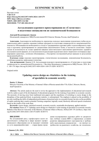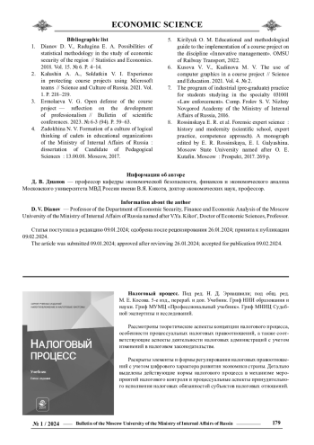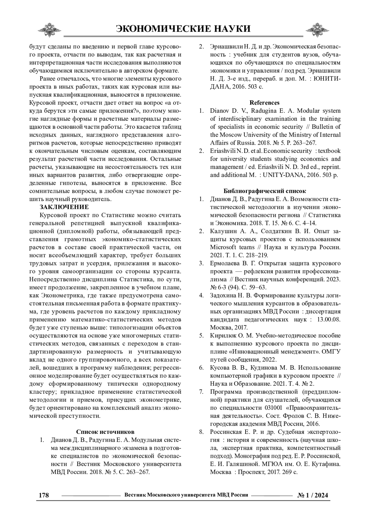 1. Дианов Д. В., Радугина Е. А. Модульная система междисциплинарного экзамена в подготовке специалистов по экономической безопасности // Вестник Московского университета МВД России. 2018. № 5. С. 263-267. EDN: VAAMUT