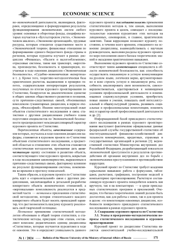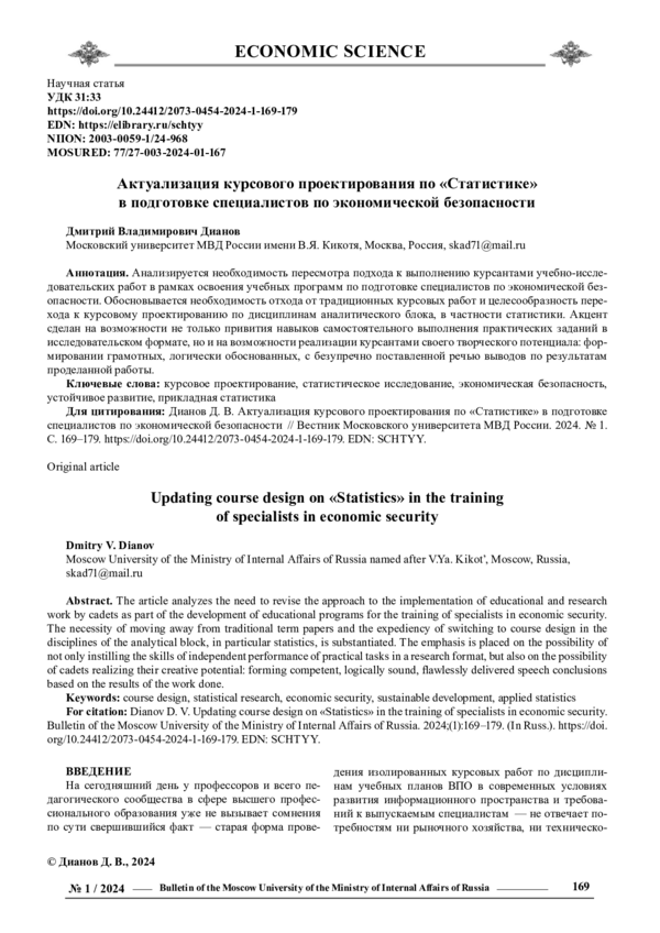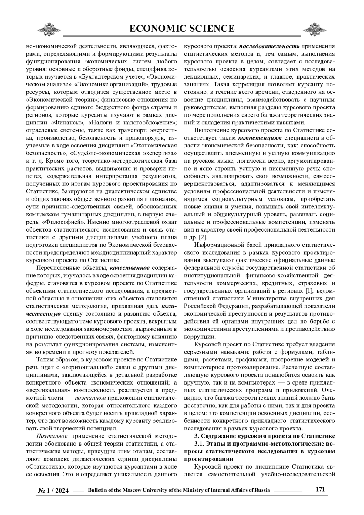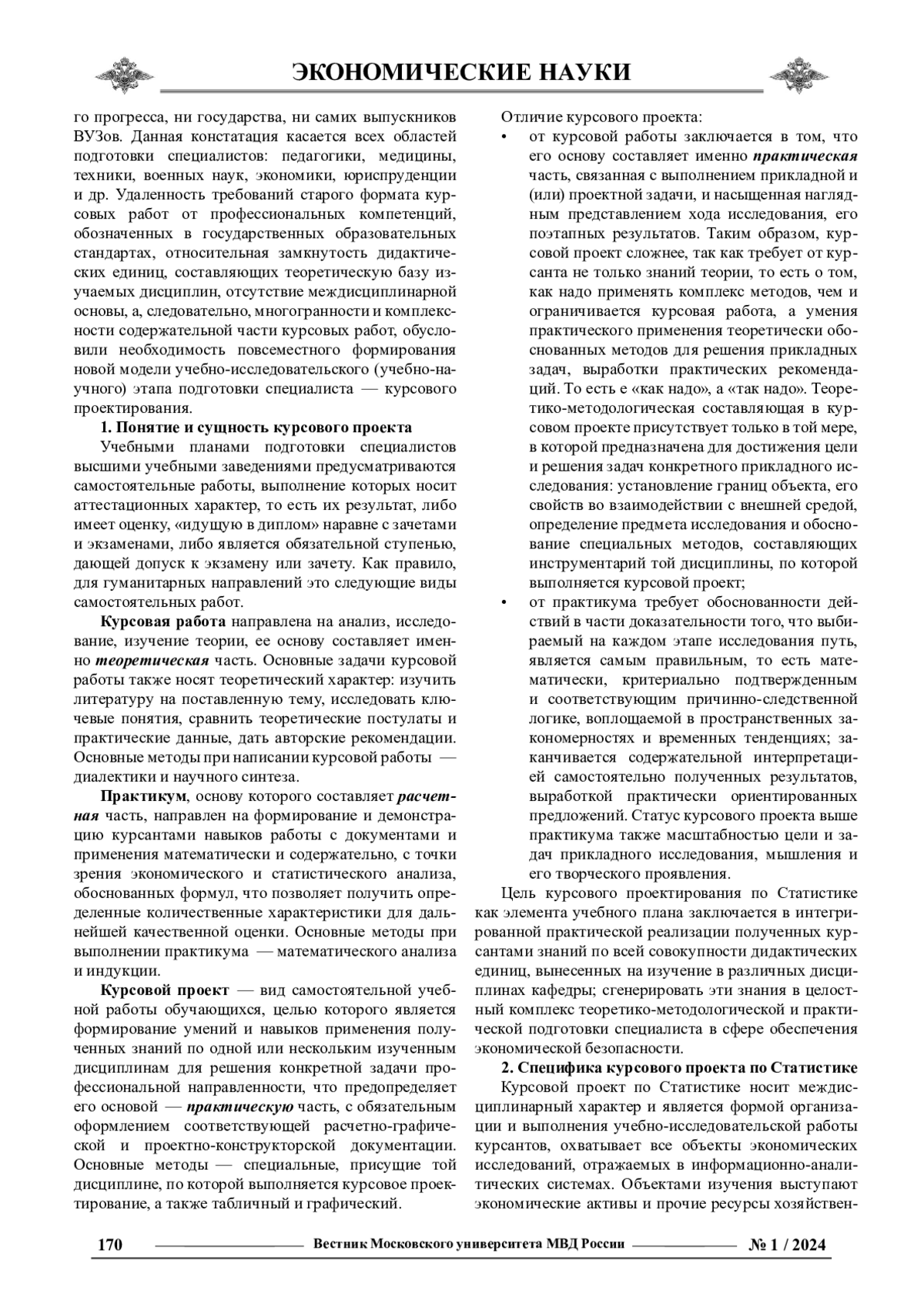 Анализируется необходимость пересмотра подхода к выполнению курсантами учебно-исследовательских работ в рамках освоения учебных программ по подготовке специалистов по экономической безопасности. Обосновывается необходимость отхода от традиционных курсовых работ и целесообразность перехода к курсовому проектированию по дисциплинам аналитического блока, в частности статистики. Акцент сделан на возможности не только привития навыков самостоятельного выполнения практических заданий в исследовательском формате, но и на возможности реализации курсантами своего творческого потенциала: формировании грамотных, логически обоснованных, с безупречно поставленной речью выводов по результатам проделанной работы.