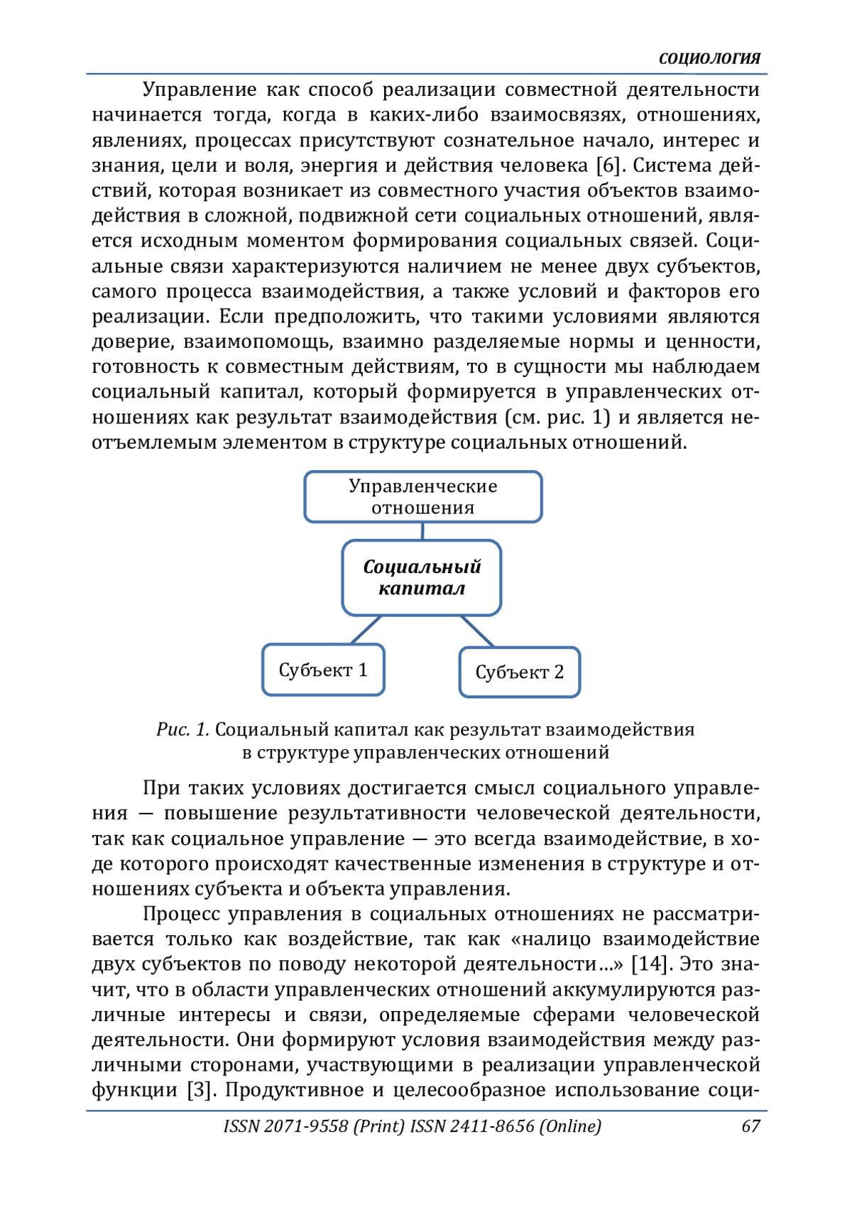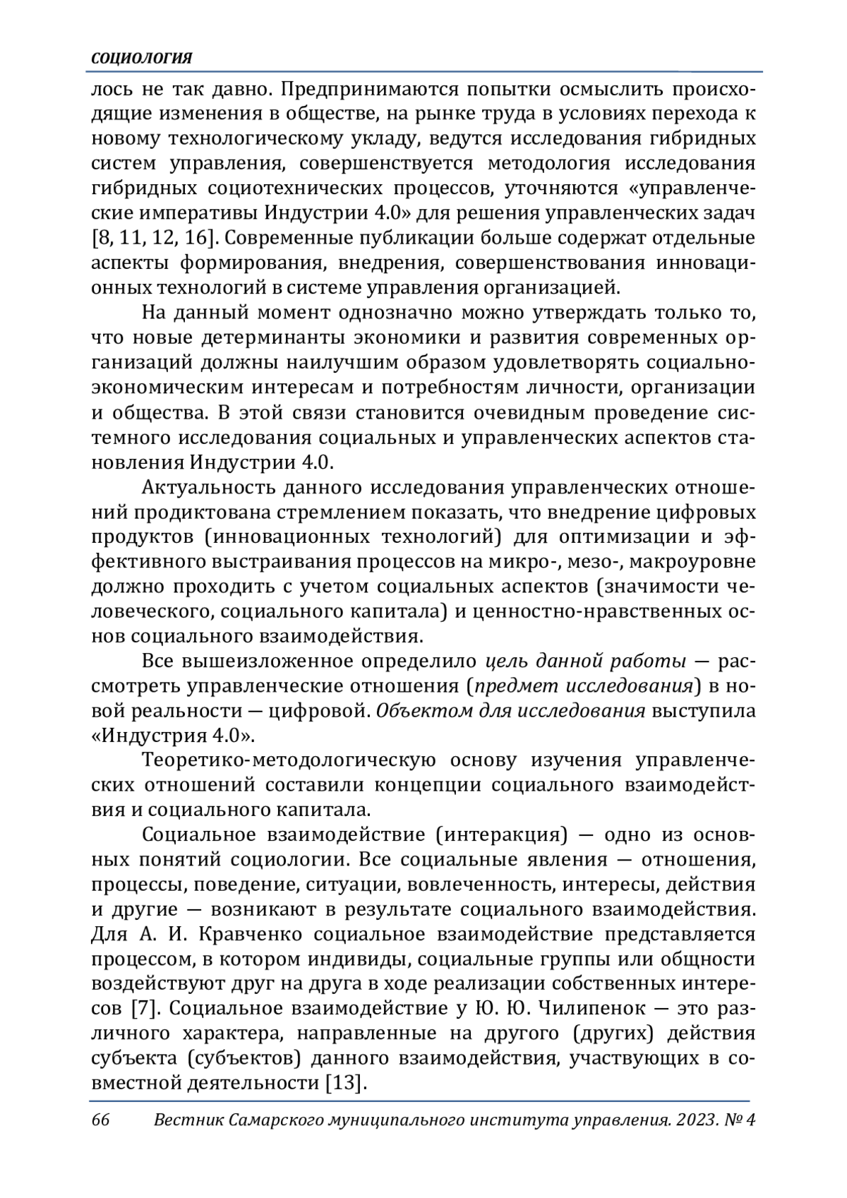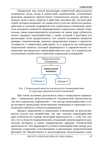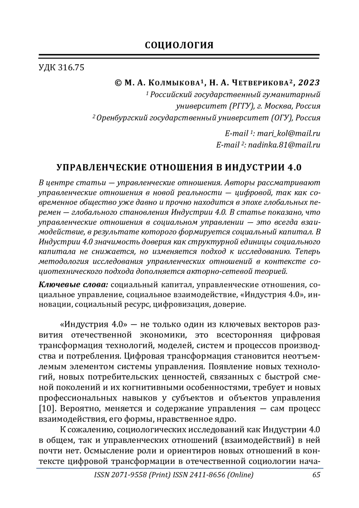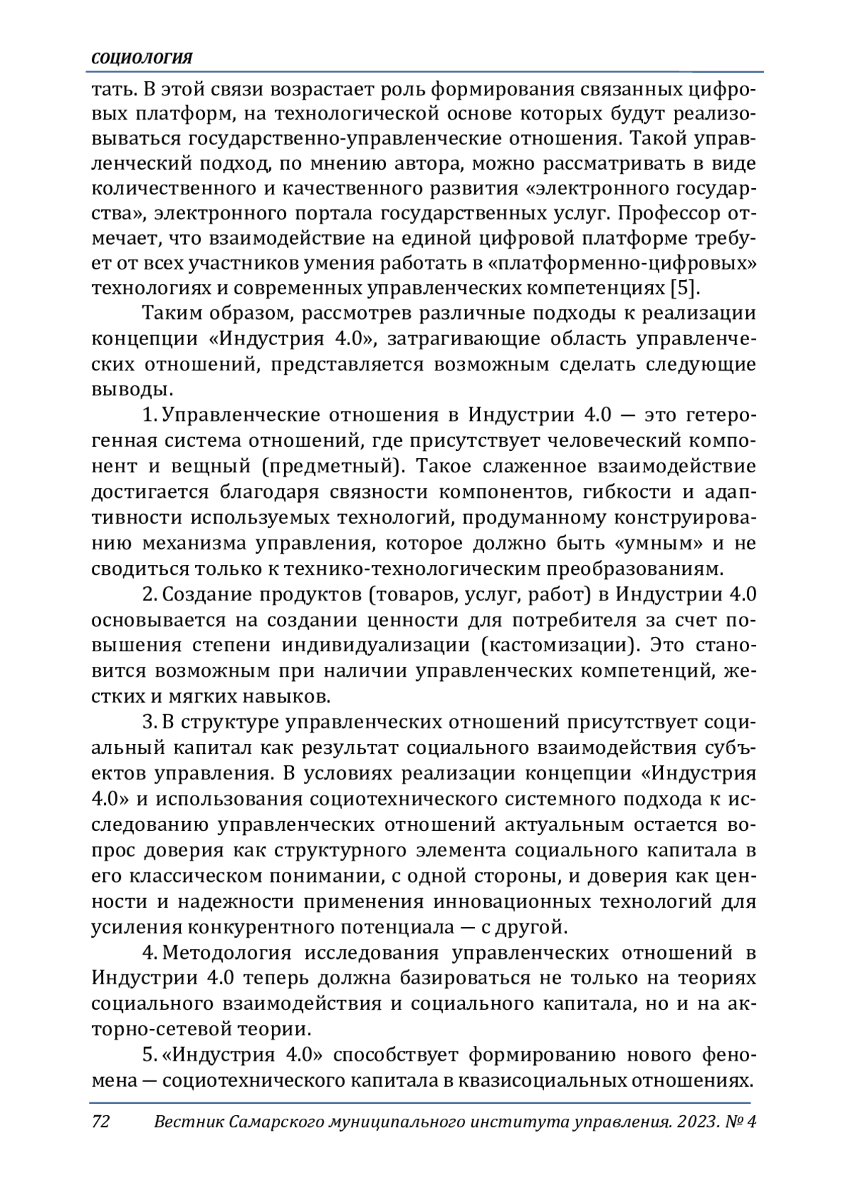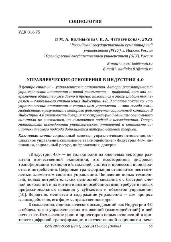 В центре статьи - управленческие отношения. Авторы рассматривают управленческие отношения в новой реальности - цифровой, так как современное общество уже давно и прочно находится в эпохе глобальных перемен - глобального становления Индустрии 4.0. В статье показано, что управленческие отношения в социальном управлении - это всегда взаимодействие, в результате которого формируется социальный капитал. В Индустрии 4.0 значимость доверия как структурной единицы социального капитала не снижается, но изменяется подход к исследованию. Теперь методология исследования управленческих отношений в контексте социотехнического подхода дополняется акторно-сетевой теорией.