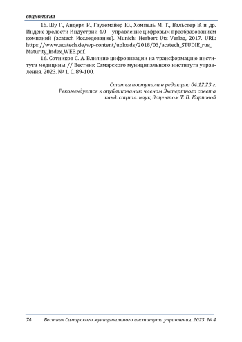 16. Сотников С. А. Влияние цифровизации на трансформацию института медицины // Вестник Самарского муниципального института управления. 2023. № 1. С. 89-100. EDN: TNXYUR