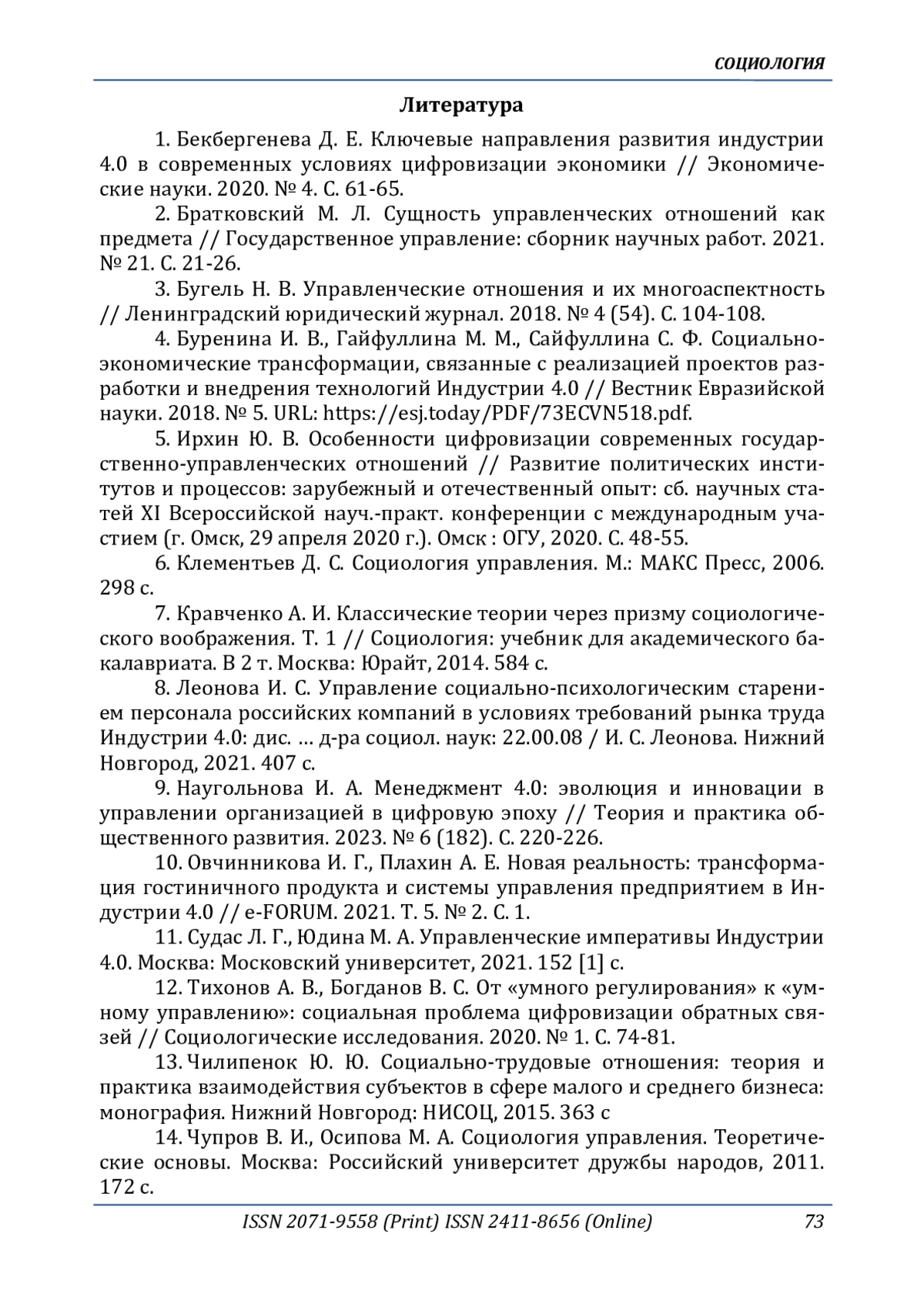 8. Леонова И. С. Управление социально-психологическим старением персонала российских компаний в условиях требований рынка труда Индустрии 4.0: дис. … д-ра социол. наук: 22.00.08 / И. С. Леонова. Нижний Новгород, 2021. 407 с. EDN: FCKISA