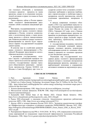 7. Доклад “ESG и зеленые финансы России 2018-2022”. Экспертно-аналитическая платформа “Инфраструктура и финансы устойчивого развития” INFRAGREEN. Москва, 2022. URL: https://infragreen.ru/frontend/images/PDF/INFRAGREEN_Green_finance_ESG_in_Russia_2018-2022-cut.pdf.