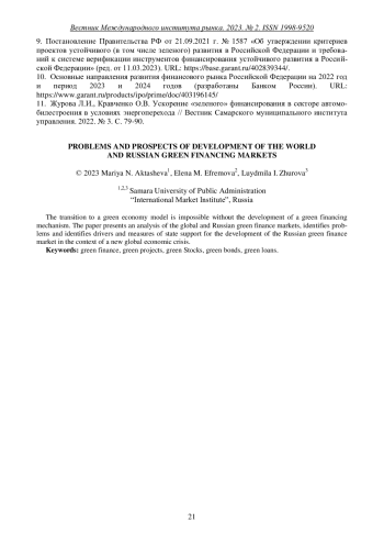 9. Постановление Правительства РФ от 21.09.2021 г. № 1587 “Об утверждении критериев проектов устойчивого (в том числе зеленого) развития в Российской Федерации и требований к системе верификации инструментов финансирования устойчивого развития в Российской Федерации” (ред. от 11.03.2023). URL: https://base.garant.ru/402839344/.