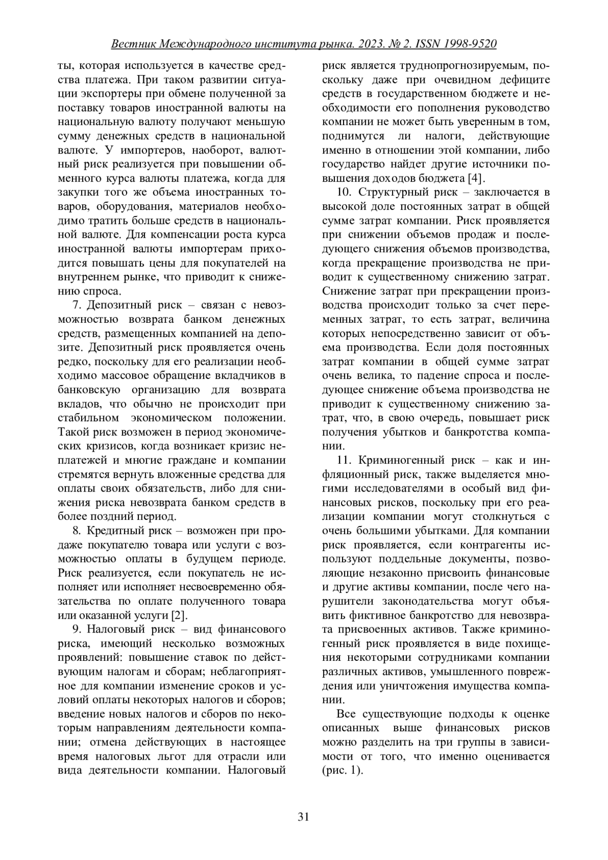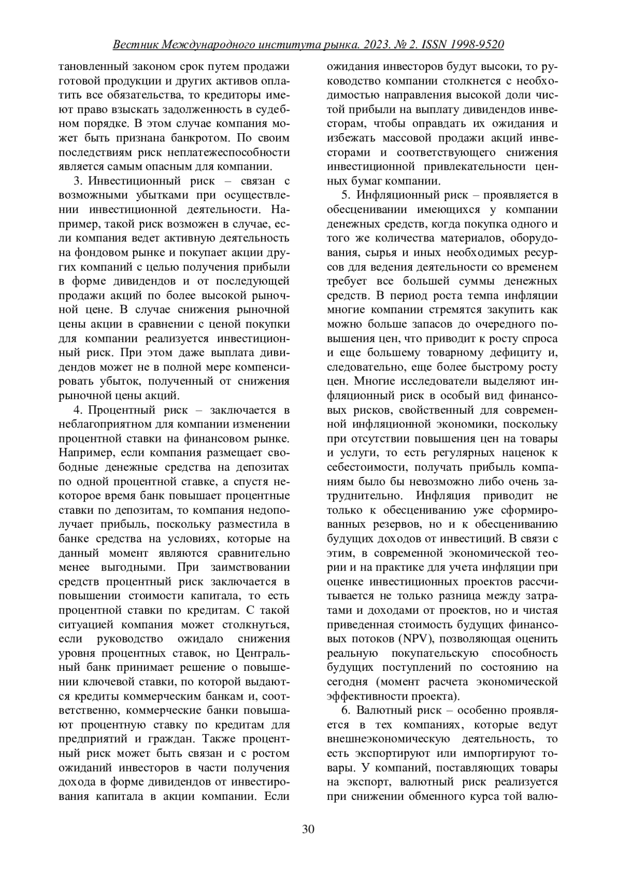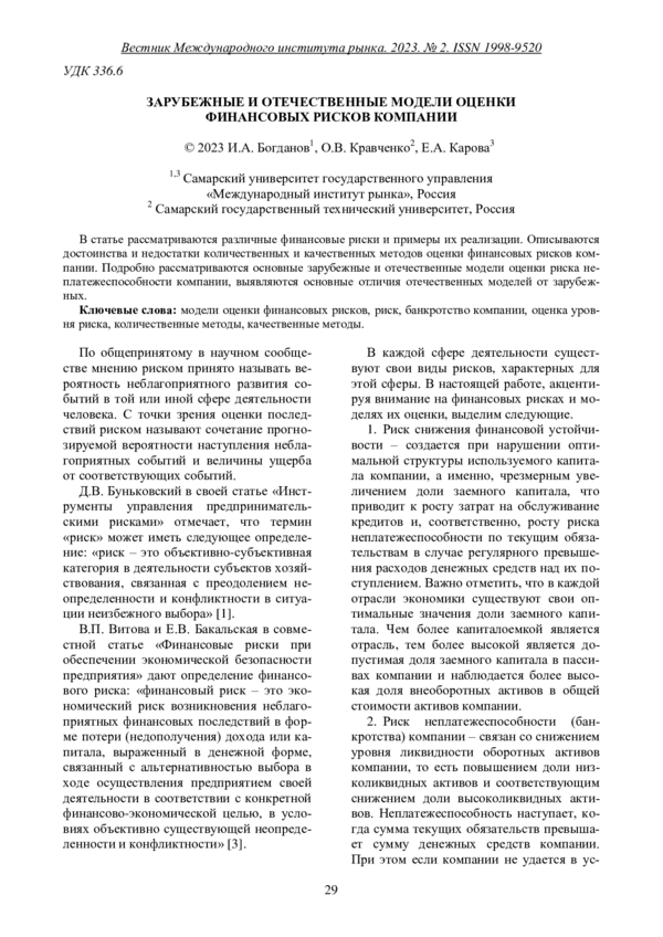 В статье рассматриваются различные финансовые риски и примеры их реализации. Описываются достоинства и недостатки количественных и качественных методов оценки финансовых рисков компании. Подробно рассматриваются основные зарубежные и отечественные модели оценки риска неплатежеспособности компании, выявляются основные отличия отечественных моделей от зарубежных.