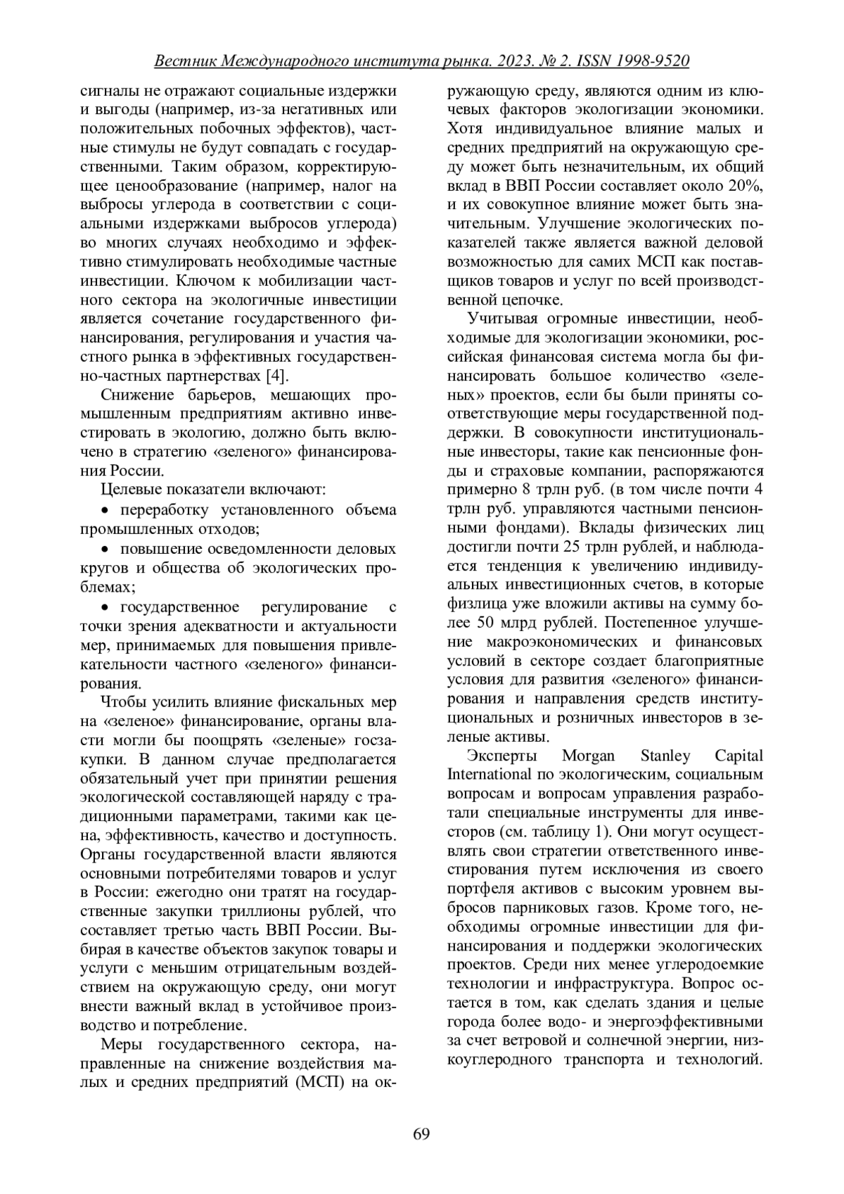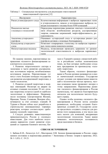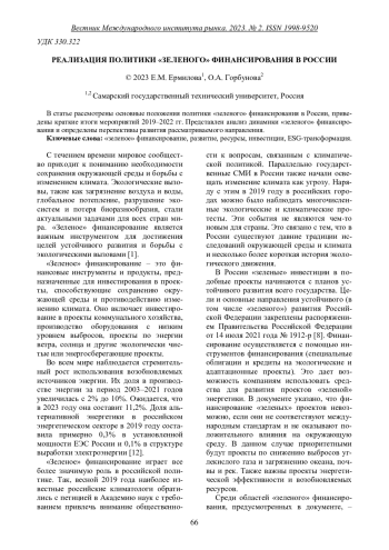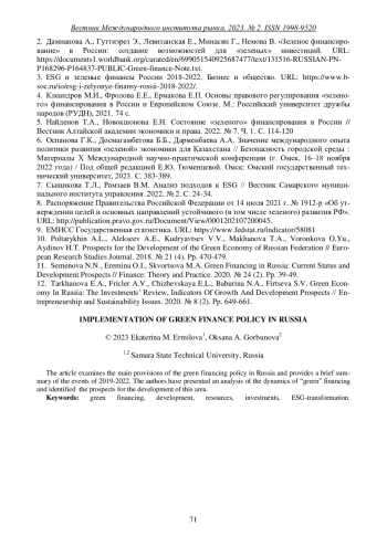 1. Бабина К.И., Легкоступ А.С., Мастерских О.В. Зеленое финансирование в России: современное состояние и перспективы развития // Экономика и бизнес: теория и практика. 2022. № 1-1 (83). С. 19-21. EDN: LWVOGH