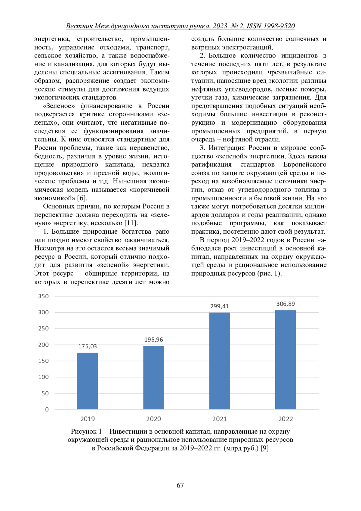 10. Poltarykhin A.L., Alekseev A.E., Kudryavtsev V.V., Makhanova T.A., Voronkova O.Yu., Aydinov H.T. Prospects for the Development of the Green Economy of Russian Federation // European Research Studies Journal. 2018. № 21 (4). Pр. 470-479. EDN: KRACNK