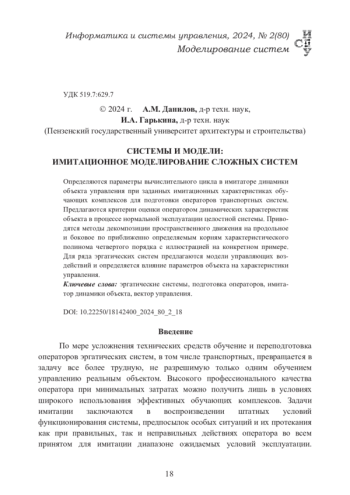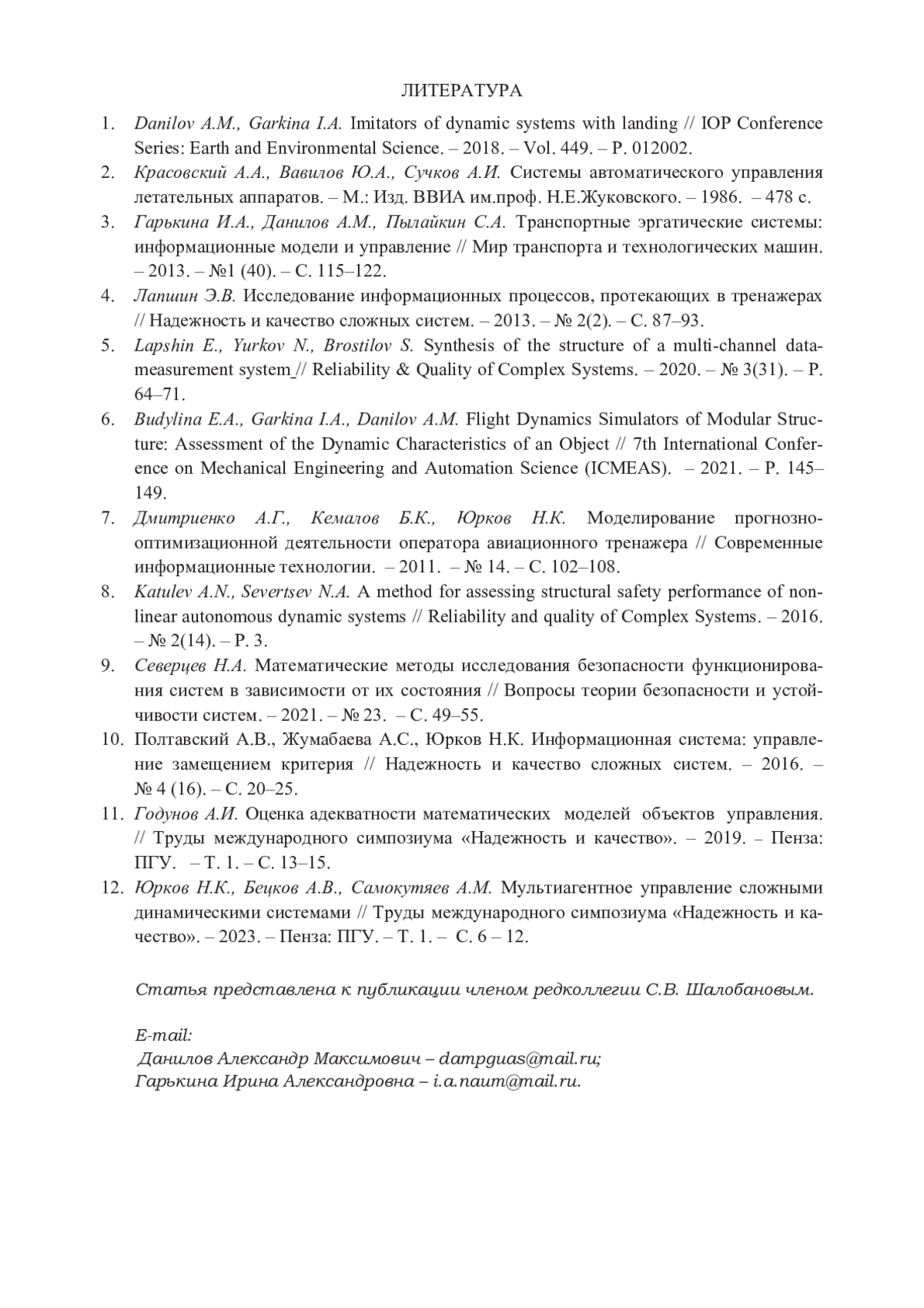 6. Budylina E.A., Garkina I.A., Danilov A.M. Flight Dynamics Simulators of Modular Structure: Assessment of the Dynamic Characteristics of an Object // 7th International Conference on Mechanical Engineering and Automation Science (ICMEAS). - 2021. - P. 145-149.