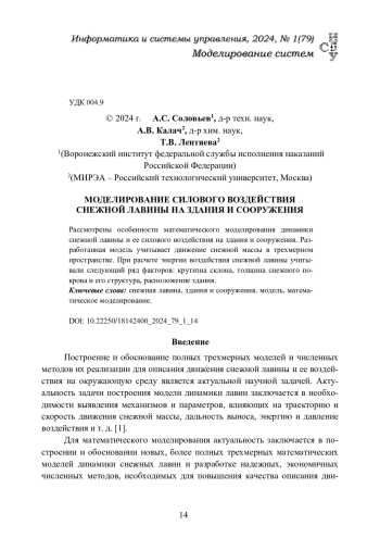 9. Соловьев А.С., Калач А.В. Пространственное моделирование движения лавиноопасной снежной массы на основе уравнений динамики поступательного движения // Вестник Российского нового университета. Серия: Сложные системы: модели, анализ и управление. - 2021. - № 4/1. - С. 27-34. EDN: AECISP