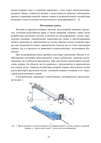 Построение и обоснование полных трехмерных моделей и численных методов их реализации для описания движения снежной лавины и ее воздействия на окружающую среду является актуальной научной задачей. Актуальность задачи построения модели динамики лавин заключается в необходимости выявления механизмов и параметров, влияющих на траекторию и скорость движения снежной массы, дальность выноса, энергию и давление воздействия и т. д.