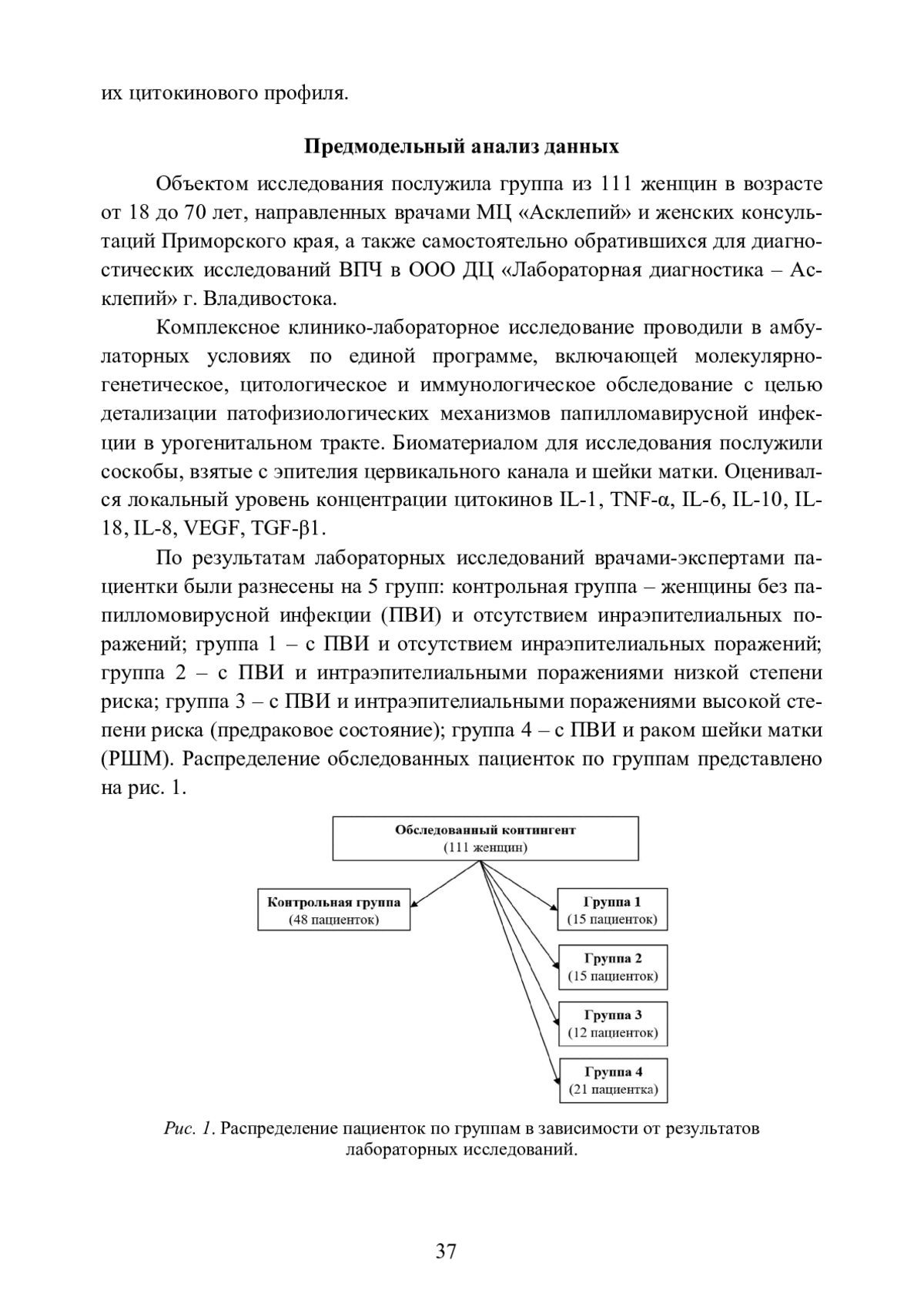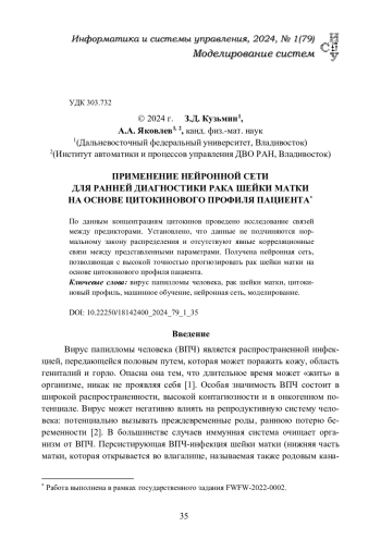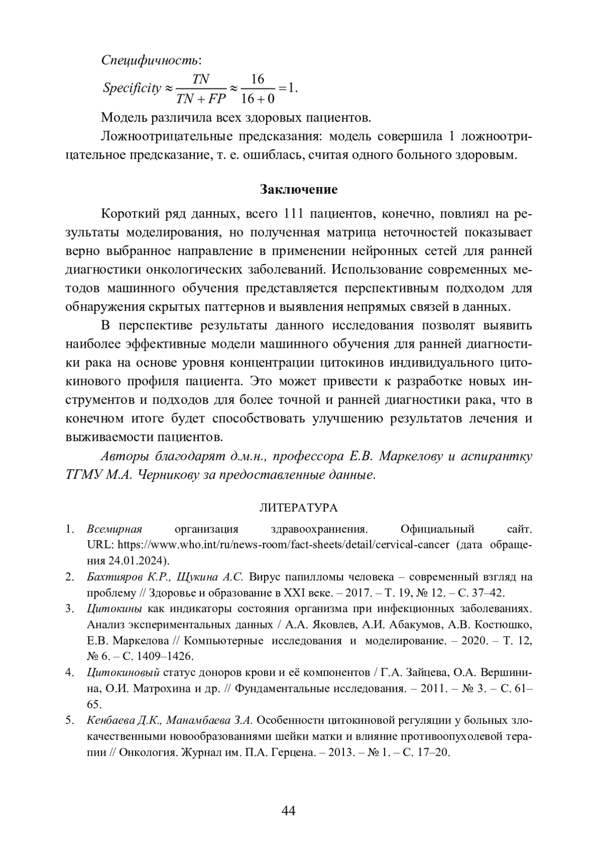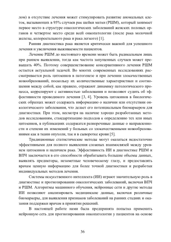 По данным концентрациям цитокинов проведено исследование связей между предикторами. Установлено, что данные не подчиняются нормальному закону распределения и отсутствуют явные корреляционные связи между представленными параметрами. Получена нейронная сеть, позволяющая с высокой точностью прогнозировать рак шейки матки на основе цитокинового профиля пациента.