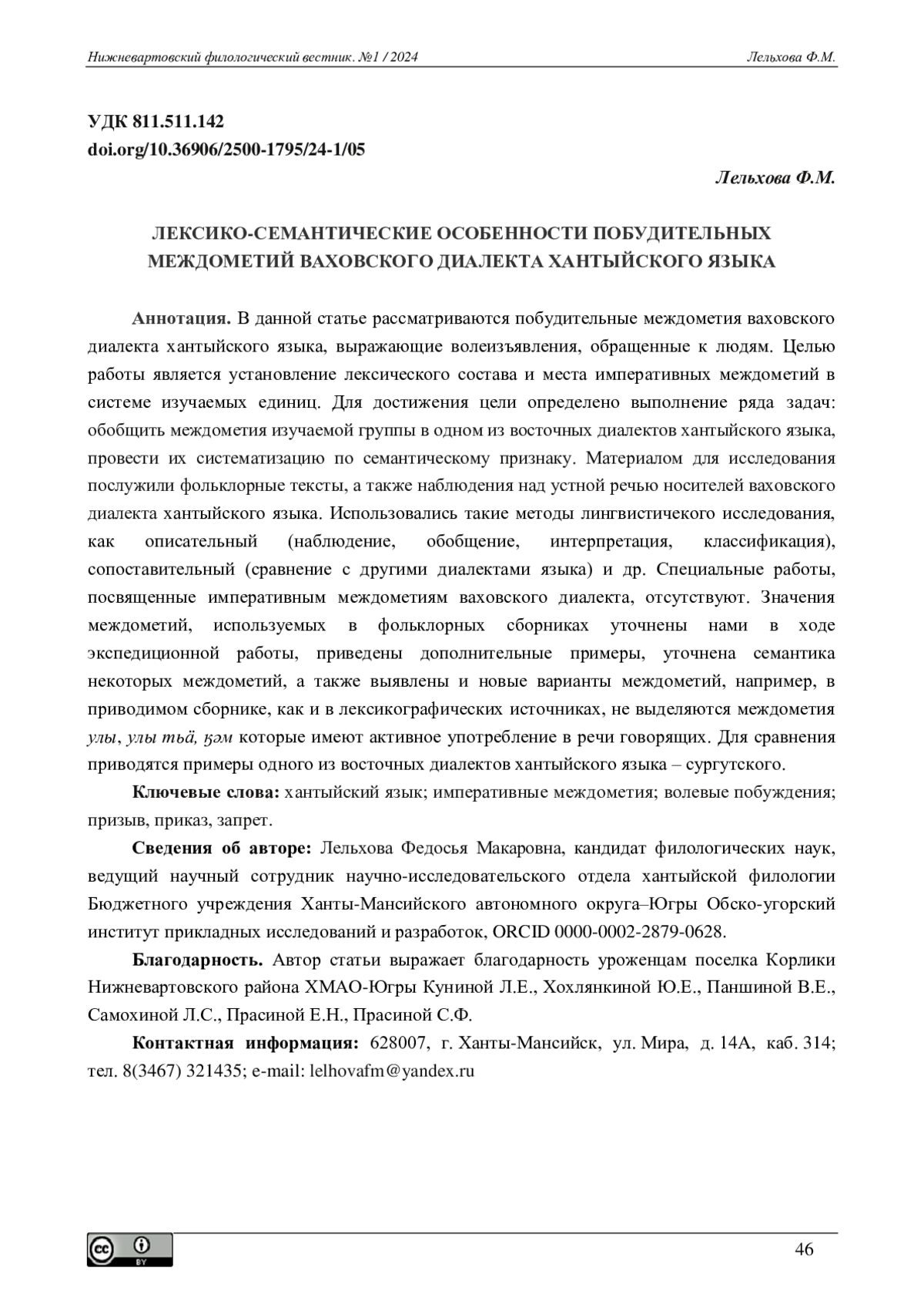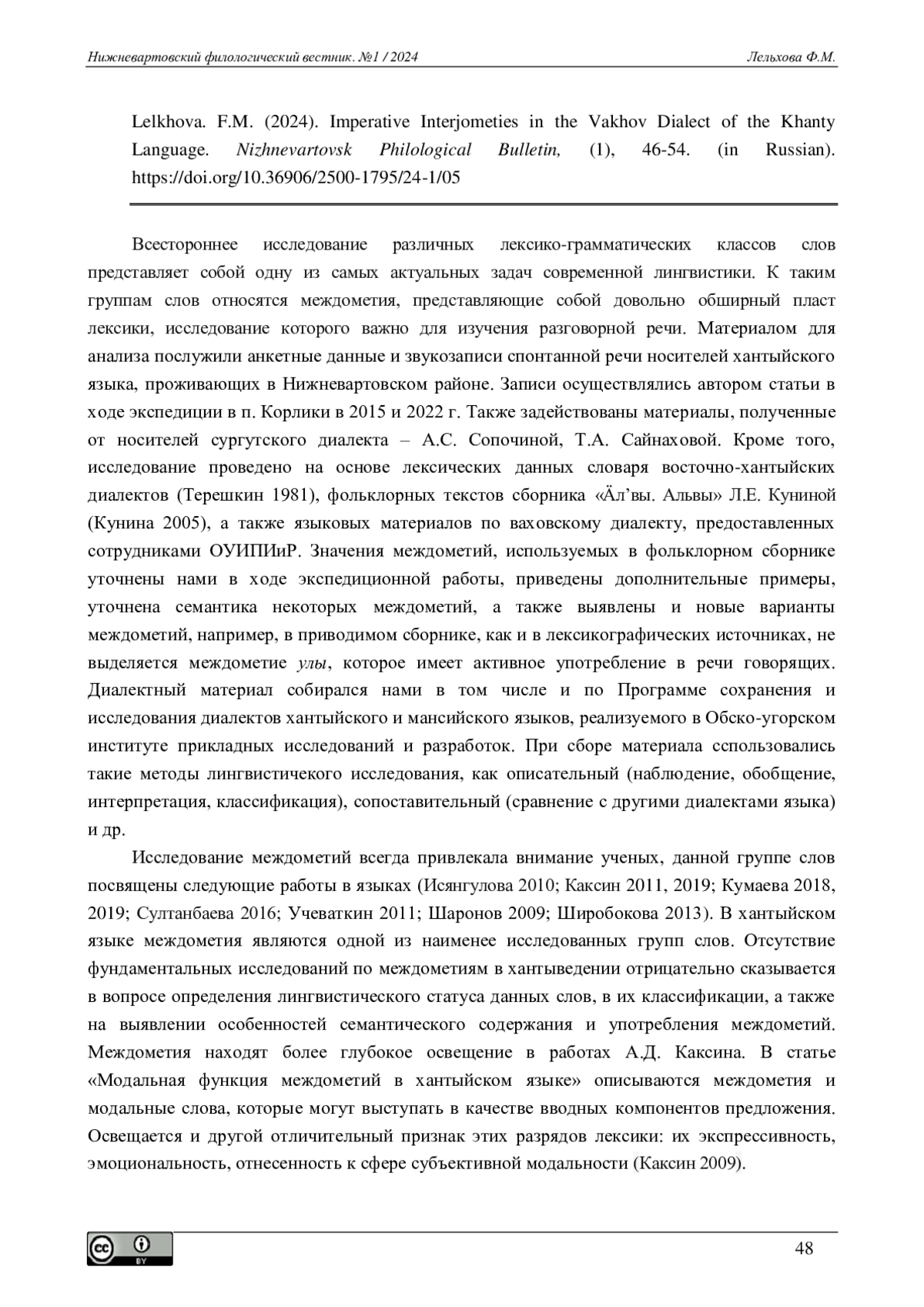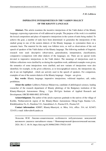 Всестороннее исследование различных лексико-грамматических классов слов представляет собой одну из самых актуальных задач современной лингвистики. К таким группам слов относятся междометия, представляющие собой довольно обширный пласт лексики, исследование которого важно для изучения разговорной речи. Материалом для анализа послужили анкетные данные и звукозаписи спонтанной речи носителей хантыйского языка, проживающих в Нижневартовском районе. Записи осуществлялись автором статьи в ходе экспедиции в п. Корлики в 2015 и 2022 г. Также задействованы материалы, полученные от носителей сургутского диалекта ‒ А. С. Сопочиной, Т. А. Сайнаховой. Кроме того, исследование проведено на основе лексических данных словаря восточно-хантыйских диалектов (Терешкин 1981), фольклорных текстов сборника «Ӓлʼвы. Альвы» Л. Е. Куниной (Кунина 2005), а также языковых материалов по ваховскому диалекту, предоставленных сотрудниками ОУИПИиР.