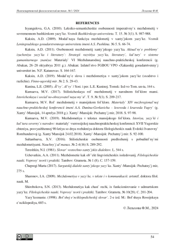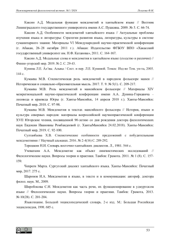 2. Каксин А. Д. Модальная функция междометий в хантыйском языке // Вестник Ленинградского государственного университета имени А. С. Пушкина. 2009. № 5. С. 66-74. EDN: KGYHWU УДК: 81.366.5