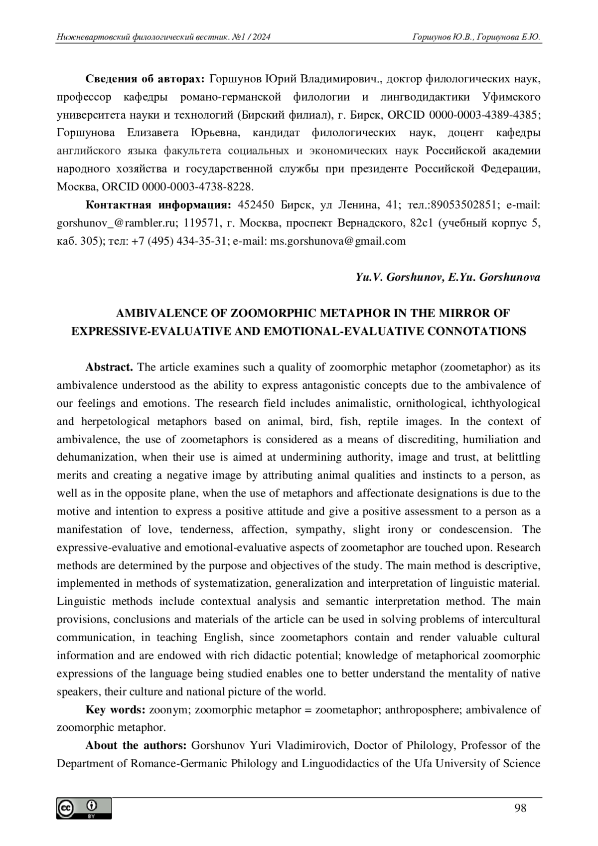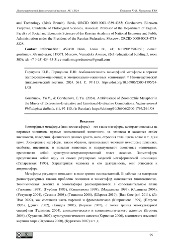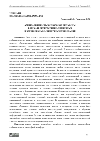 Цель статьи - рассмотреть такое качество зооморфной метафоры как ее амбивалентность, понимаемую авторами как способность выражать антагонистические понятия, обусловленные амбивалентностью наших чувств и эмоций, на примере анималистических, орнитологических, ихтиологически и герпетологических метафор, основанных на образах животных, птиц, рыб и рептилий. В контексте амбивалентности рассмотрено использование зоометафор как средство дискредитации, уничижения, дегуманизации, когда они используются, чтобы подорвать авторитет, имидж, доверие, умалить заслуги и создать негативный образ, приписывая человеку животные качества и инстинкты, а также в противоположной плоскости, когда использование метафор и ласковых обозначений обусловлено мотивом и интенцией выразить положительное отношение, дать положительную оценку человеку как проявление любви, нежности, ласки, симпатии, сочувствия, легкой иронии или снисходительности. Затронуты экспрессивно-оценочные и эмоционально-оценочные аспекты зоометафоры. Методы исследования определяются целью и задачами исследования. Основной метод описательный, реализованный в приемах систематизации, обобщения и интерпретации языкового материала. Лингвистические методы включают контекстный анализ и метод семантической интерпретации. Проведенное исследование подтверждает положение, что зоонимы не содержат оценки, а перенос на человека признаков животных и создание зоометафоры сопряжены с оценочными коннотациями, в большинстве своем отрицательными. На примере зоонимов и переноса их на человека были рассмотрены такие качества, как глупость/глупый человек; упрямство/упрямый человек; странный, неприятный, презренный человек или человек, вызывающий отвращение и некоторые другие. В противовес им были рассмотрены зоометафоры положительно характеризующие и оценивающие человека и некоторые ласковые обращения. Основные положения, выводы и материалы статьи могут быть использованы при решении проблем межкультурной коммуникации, в обучении английскому языку, так как зоометафоры обладают ценной культурологической информацией и наделены богатым дидактическим потенциалом; знание метафорических зооморфных выражений изучаемого языка позволяет лучше осознать менталитет носителей языка, их культуру и национальную картину мира.