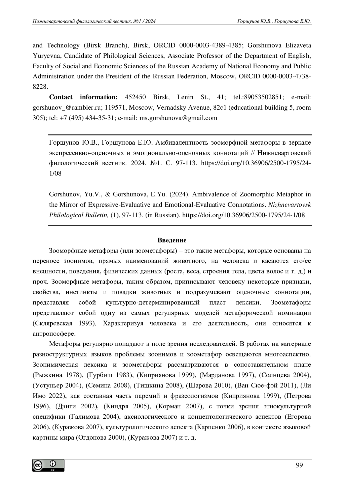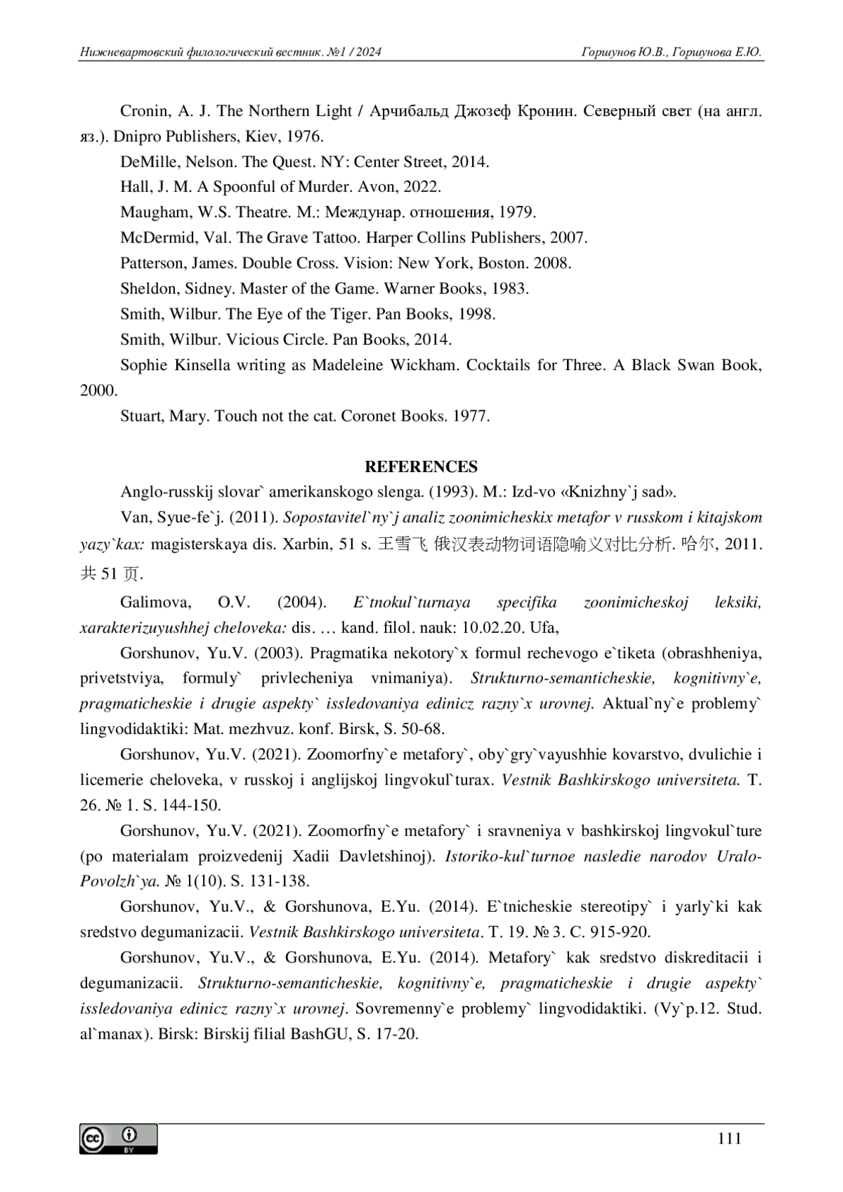 5. Горшунов Ю. В. Зооморфные метафоры, обыгрывающие коварство, двуличие и лицемерие человека, в русской и английской лингвокультурах // Вестник Башкирского университета. 2021. Т. 26. № 1. С. 144-150. EDN: UNBDSQ
