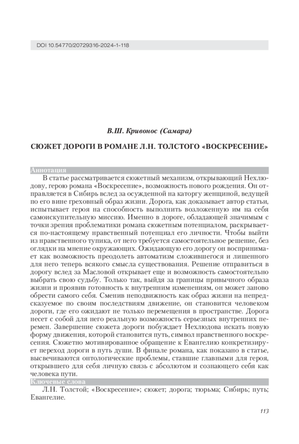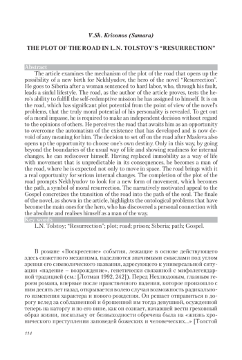 В статье рассматривается сюжетный механизм, открывающий Нехлюдову, герою романа «Воскресение», возможность нового рождения. Он отправляется в Сибирь вслед за осужденной на каторгу женщиной, ведущей по его вине греховный образ жизни. Дорога, как доказывает автор статьи, испытывает героя на способность выполнить возложенную им на себя самоискупительную миссию. Именно в дороге, обладающей значимым с точки зрения проблематики романа сюжетным потенциалом, раскрывается по-настоящему нравственный потенциал его личности. Чтобы выйти из нравственного тупика, от него требуется самостоятельное решение, без оглядки на мнение окружающих. Ожидающую его дорогу он воспринимает как возможность преодолеть автоматизм сложившегося и лишенного для него теперь всякого смысла существования. Решение отправиться в дорогу вслед за Масловой открывает еще и возможность самостоятельно выбрать свою судьбу. Только так, выйдя за границы привычного образа жизни и проявив готовность к внутренним изменениям, он может заново обрести самого себя. Сменив неподвижность как образ жизни на непредсказуемое по своим последствиям движение, он становится человеком дороги, где его ожидают не только перемещения в пространстве. Дорога несет с собой для него реальную возможность серьезных внутренних перемен. Завершение сюжета дороги побуждает Нехлюдова искать новую форму движения, которой становится путь, символ нравственного воскресения. Сюжетно мотивированное обращение к Евангелию конкретизирует переход дороги в путь души. В финале романа, как показано в статье, высвечиваются онтологические проблемы, ставшие главными для героя, открывшего для себя личную связь с абсолютом и сознающего себя как человека пути.