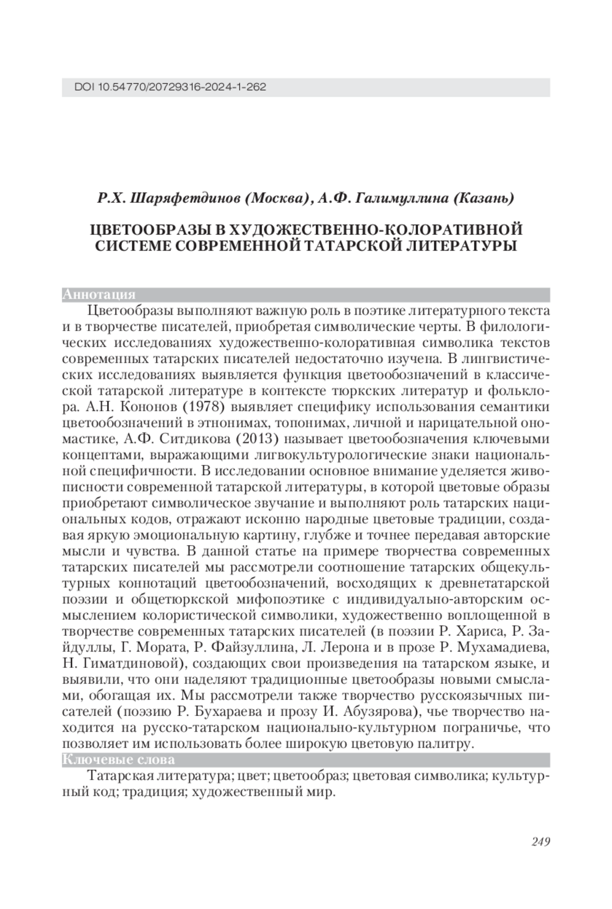 Цветообразы выполняют важную роль в поэтике литературного текста и в творчестве писателей, приобретая символические черты. В филологических исследованиях художественно-колоративная символика текстов современных татарских писателей недостаточно изучена. В лингвистических исследованиях выявляется функция цветообозначений в классической татарской литературе в контексте тюркских литератур и фольклора. А. Н. Кононов (1978) выявляет специфику использования семантики цветообозначений в этнонимах, топонимах, личной и нарицательной ономастике, А. Ф. Ситдикова (2013) называет цветообозначения ключевыми концептами, выражающими лигвокультурологические знаки национальной специфичности. В исследовании основное внимание уделяется живописности современной татарской литературы, в которой цветовые образы приобретают символическое звучание и выполняют роль татарских национальных кодов, отражают исконно народные цветовые традиции, создавая яркую эмоциональную картину, глубже и точнее передавая авторские мысли и чувства. В данной статье на примере творчества современных татарских писателей мы рассмотрели соотношение татарских общекультурных коннотаций цветообозначений, восходящих к древнетатарской поэзии и общетюркской мифопоэтике с индивидуально-авторским осмыслением колористической символики, художественно воплощенной в творчестве современных татарских писателей (в поэзии Р. Хариса, Р. Зайдуллы, Г. Мората, Р. Файзуллина, Л. Лерона и в прозе Р. Мухамадиева, Н. Гиматдиновой), создающих свои произведения на татарском языке, и выявили, что они наделяют традиционные цветообразы новыми смыслами, обогащая их. Мы рассмотрели также творчество русскоязычных писателей (поэзию Р. Бухараева и прозу И. Абузярова), чье творчество находится на русско-татарском национально-культурном пограничье, что позволяет им использовать более широкую цветовую палитру.