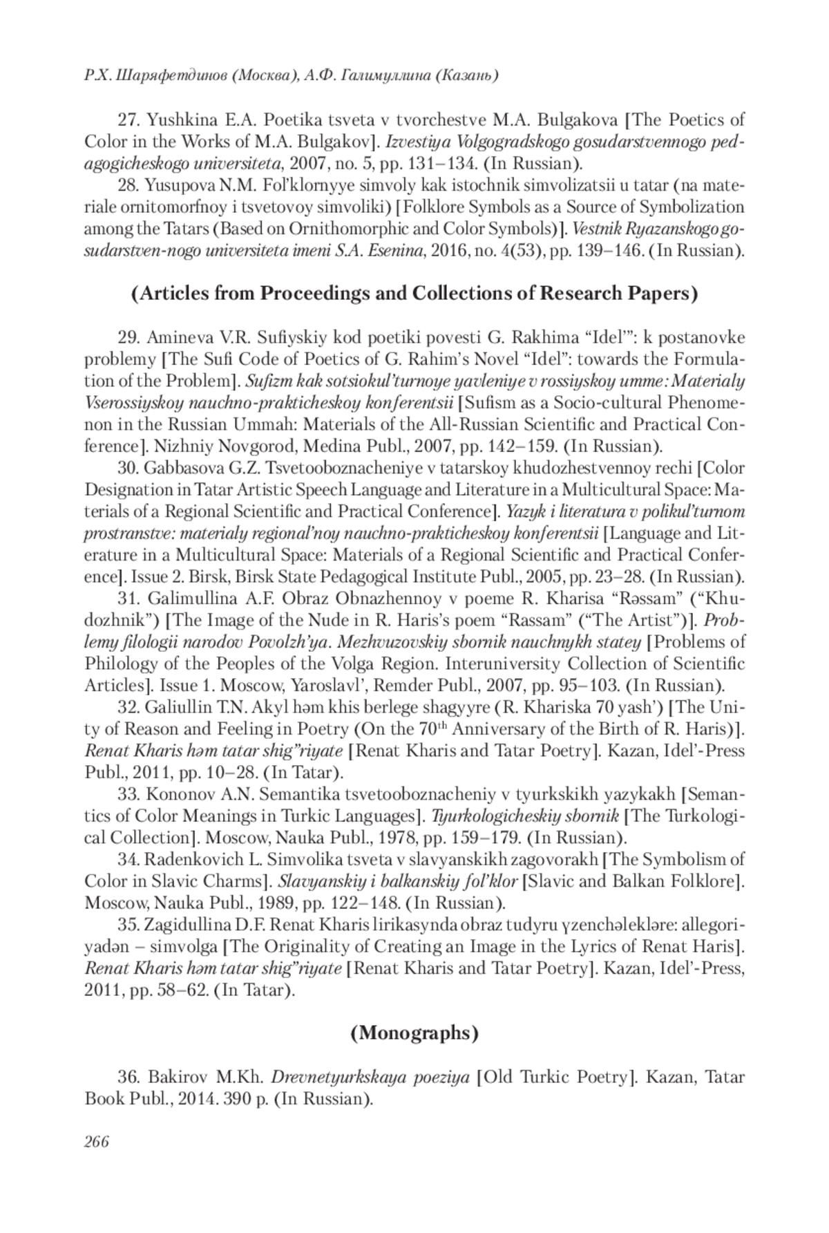 14. Василова А.Ш. Семантика цветообозначений сары (“желтый”) в татарской поэзии // Ученые записки Казанского университета. Серия: Гуманитарные науки. 2016. Т. 158. Кн. 5. С. 1300-1307. EDN: VVHJKQ
