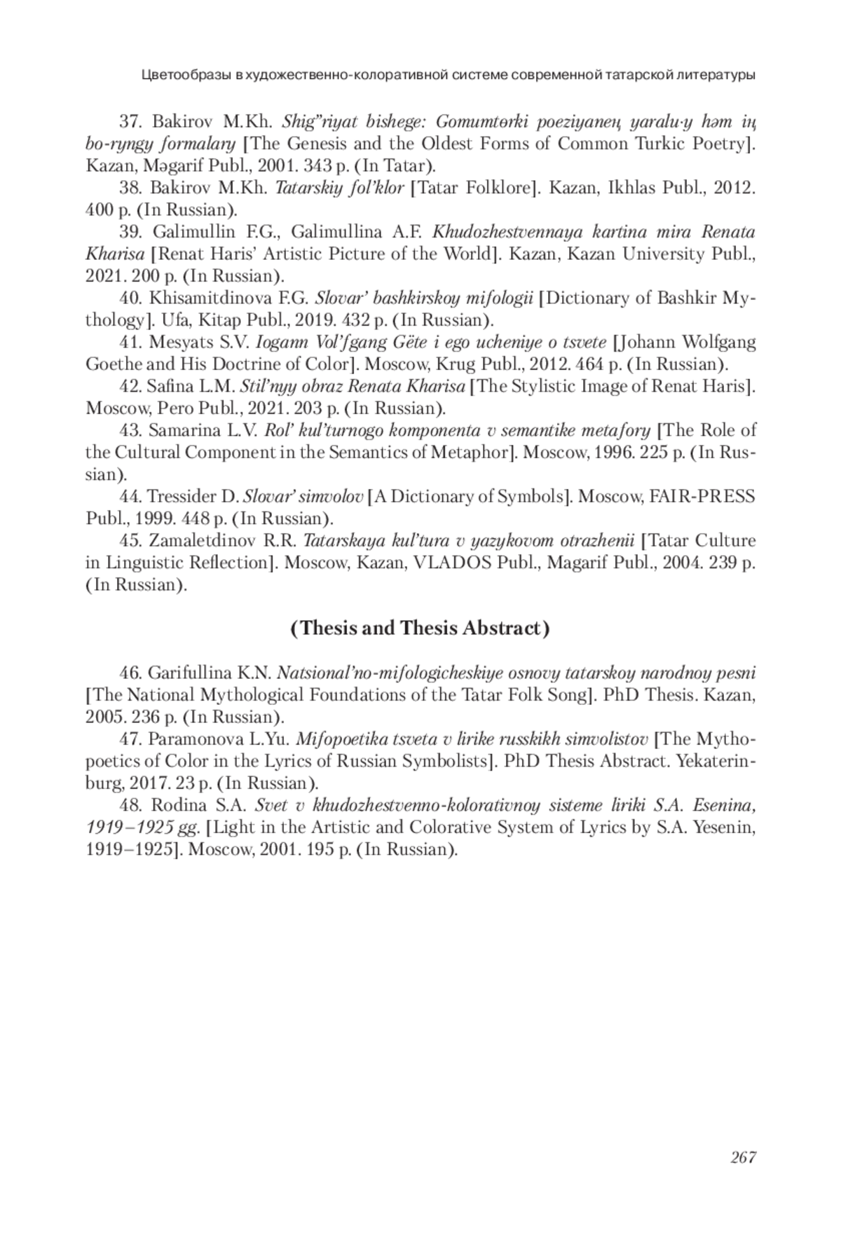 47. Сабирова Г.А. Цвет в творчестве татарских писателей-импрессионистов начала ХХ века // Вестник Костромского государственного университета имени Н.А. Некрасова. 2007. № 4. С. 146-148. EDN: MTCAIX