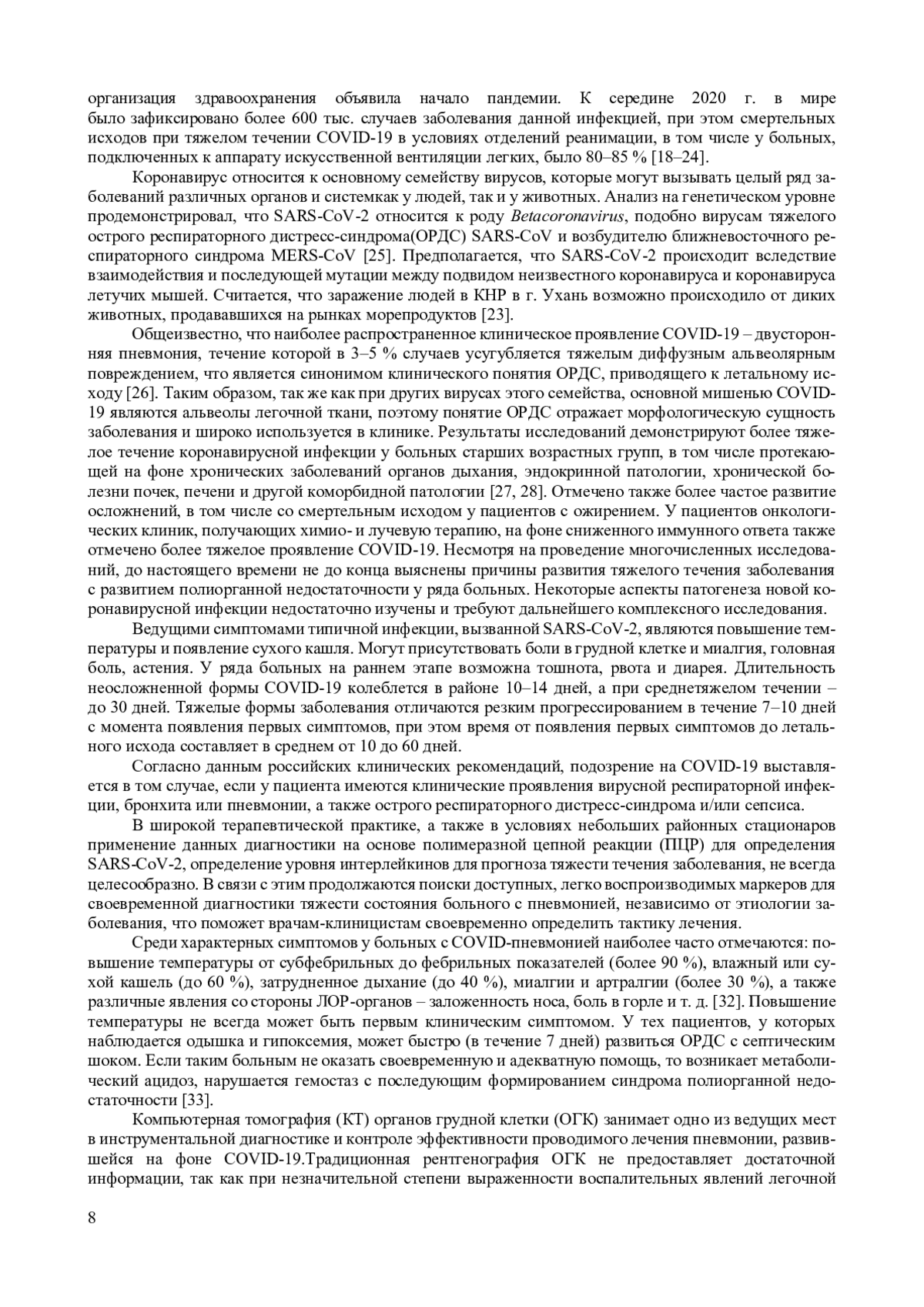 В марте 2020 г. Всемирной организацией здравоохранения зарегистрирована пандемия COVID-19, заболевание, вызываемое коронавирусом SARS-CoV-2, что стало историческим фактом и привело к глобальной катастрофе мирового уровня. Доказано, что наиболее распространенной клинической картиной новой вирусной инфекции является пневмония, которая у большинства пациентов часто осложняется острым респираторным дистресс-синдромом. Однако не снижающаяся смертность пациентов с пневмонией, поиск рациональных вариантов лечения тяжелой пневмонии уже давно беспокоят клиницистов, а в условиях пандемии COVID-19 остаются весьма актуальными. По данным Всемирной организации здравоохранения, пневмония занимает 4 место в структуре причин смерти, смертность от нее составляет 5 %, а среди пожилых пациентов достигает 30 %. Согласно статистическим данным, представленным многими авторами, более 25 % больных пневмонией, поступающих в отделения интенсивной терапии, умирают от септических осложнений. В диагностике тяжелых форм пневмонии нередко допускаются ошибки, особенно при госпитализации пациентов, нуждающихся в реанимационных мероприятиях, которые позволяют определить наиболее адекватную этиопатогенетическую терапию (противовирусную, антибактериальную, дезинтоксикационную) и прогнозировать неблагоприятный исход пневмонии. Многими авторами доказано, что на тяжесть состояния больных пневмонией влияют интоксикационный синдром, снижение реактивности организма и обмена веществ, сопутствующий коморбидный фон, дыхательная и сердечно-сосудистая недостаточность.