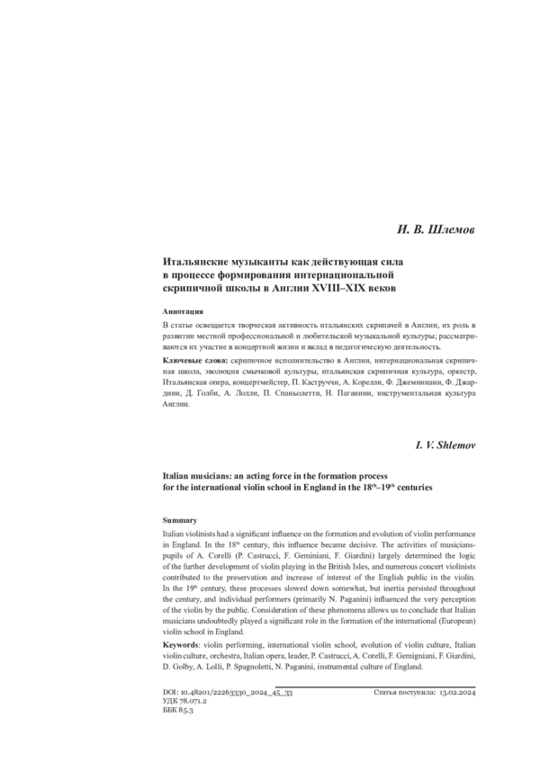 В статье освещается творческая активность итальянских скрипачей в Англии, их роль в развитии местной профессиональной и любительской музыкальной культуры; рассматриваются их участие в концертной жизни и вклад в педагогическую деятельность.