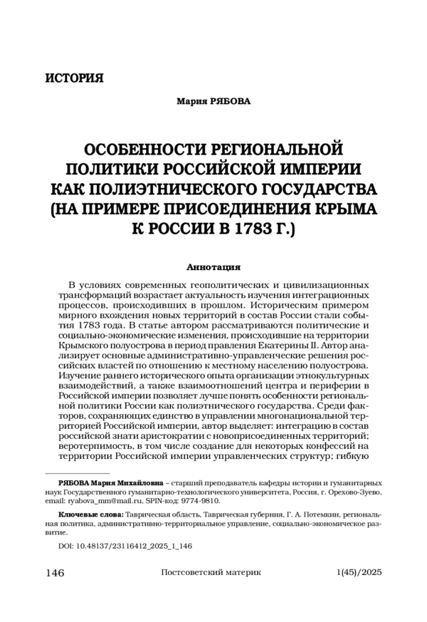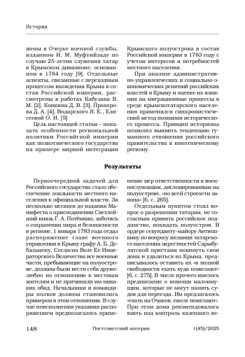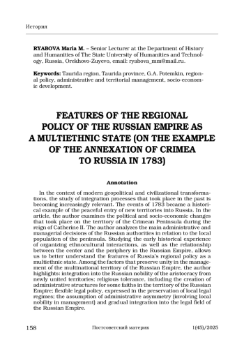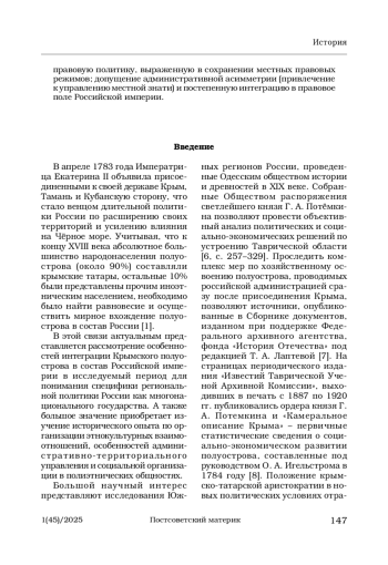 В условиях современных геополитических и цивилизационных трансформаций возрастает актуальность изучения интеграционных процессов, происходивших в прошлом. Историческим примером мирного вхождения новых территорий в состав России стали события 1783 года. В статье автором рассматриваются политические и социально-экономические изменения, происходившие на территории Крымского полуострова в период правления Екатерины II. Автор анализирует основные административно-управленческие решения российских властей по отношению к местному населению полуострова. Изучение раннего исторического опыта организации этнокультурных взаимодействий, а также взаимоотношений центра и периферии в Российской империи позволяет лучше понять особенности региональной политики России как полиэтнического государства. Среди факторов, сохраняющих единство в управлении многонациональной территорией Российской империи, автор выделяет: интеграцию в состав российской знати аристократии с новоприсоединенных территорий; веротерпимость, в том числе создание для некоторых конфессий на территории Российской империи управленческих структур; гибкую правовую политику, выраженную в сохранении местных правовых режимов; допущение административной асимметрии (привлечение к управлению местной знати) и постепенную интеграцию в правовое поле Российской империи.