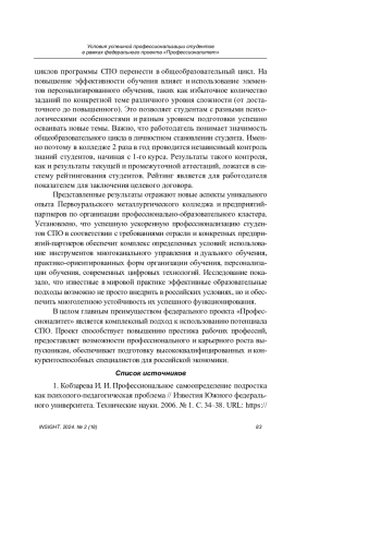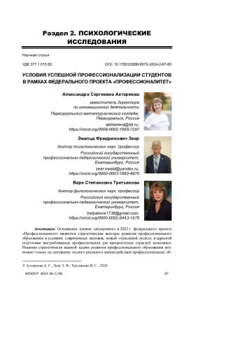 Основными идеями запущенного в 2022 г. федерального проекта«Профессионалитет» являются стратегические векторы развития профессионального образования в условиях современных вызовов, новый отраслевой подход в адресной подготовке востребованных профессионалов для приоритетных отраслей экономики. Решение стратегически важной задачи развития профессионального образования возможно только на основании тесного реального взаимодействия профессиональных образовательных организаций СПО с работодателями, индустриальными партнерами, чей заказ на подготовку кадров выполняют колледжи и техникумы. Проблема исследования заключается в необходимости ответить на вопрос: как добиться успешного профессионального становления специалистов среднего звена, чтобы обеспечить потребности отраслевых рынков труда и конкретных предприятий региона? Целью статьи является обобщение опыта реализации федерального проекта «Профессионалитет» по подготовке нового специалиста в одном из самых крупных кластеров Свердловской области - металлургическом кластере на базе Первоуральского металлургического колледжа.