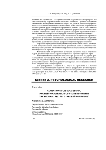 15. Ахтариева А. С. Опыт реализации федерального проекта “Профессионалитет” в Первоуральском металлургическом колледже: итоги первого года // Векторы взаимодействия: СПО - вуз - предприятие: материалы Всерос. науч.-практ. конф. “Векторы взаимодействия среднего профессионального образования и базовых предприятий при реализации проекта “Профессионалитет”: синергия партнерства”, Первоуральск, 23 марта 2023 г. Екатеринбург; Первоуральск / Рос. гос. проф.- пед. ун-т. 2023. С. 18-25. URL: https://elar.rsvpu.ru/handle/123456789/43033. EDN: HAFMOU