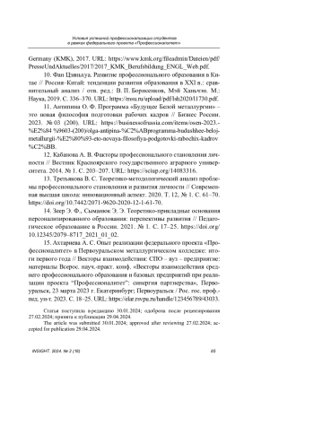 9. Eisenmann S. German Vocational Training and Education Cooperation. Possibilities for Transferring a Successful Education and Training Principle. Berlin: Secretariat of the Standing Conference of the Ministers of Education and Cultural Affairs of the Länder in the Federal Republic of Germany (KMK), 2017. URL: https://www.kmk.org/fileadmin/Dateien/pdf/PresseUndAktuelles/2017/2017_KMK_Berufsbildung_ENGL_Web.pdf.