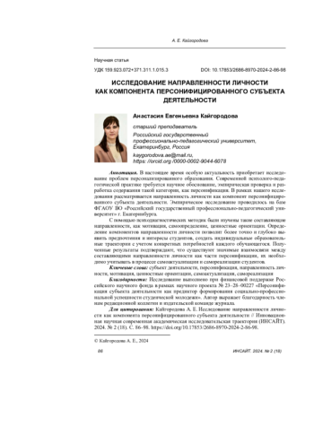В настоящее время особую актуальность приобретает исследование проблем персонализированного образования. Современной психолого-педагогической практике требуется научное обоснование, эмпирическая проверка и разработка содержания такой категории, как персонификация. В рамках нашего исследования рассматривается направленность личности как компонент персонифицированного субъекта деятельности. Эмпирическое исследование проводилось на базе ФГАОУ ВО «Российский государственный профессионально-педагогический университет» г. Екатеринбурга.