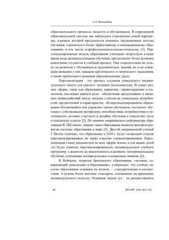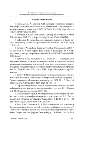 6. Зеер Э. Ф. Персонализированная учебная деятельность обучающихся как фактор их подготовки к профессиональному будущему // Профессиональное образование и рынок труда. 2021. № 1. С. 104-114. DOI: 10.24412/2307-4264-2021-01-104-114 EDN: LSZXUT