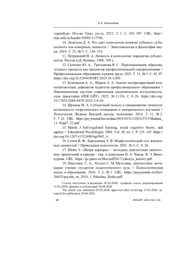 8. Исследование социально-профессиональной успешности личности на основе персонификации субъекта деятельности / В. С. Третьякова [и др.] // Science for Education Today. 2023. Т. 13, № 3. С. 101-124. DOI: 10.15293/2658-6762.2303.05 EDN: FEMCCB