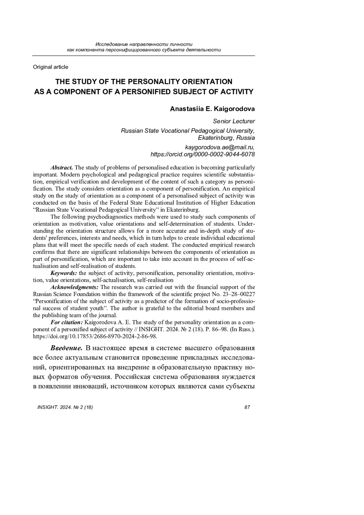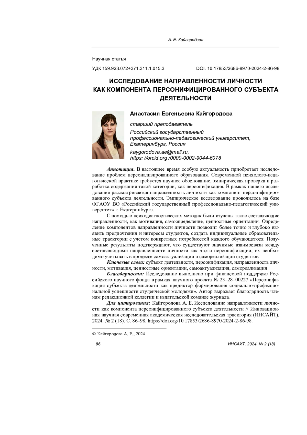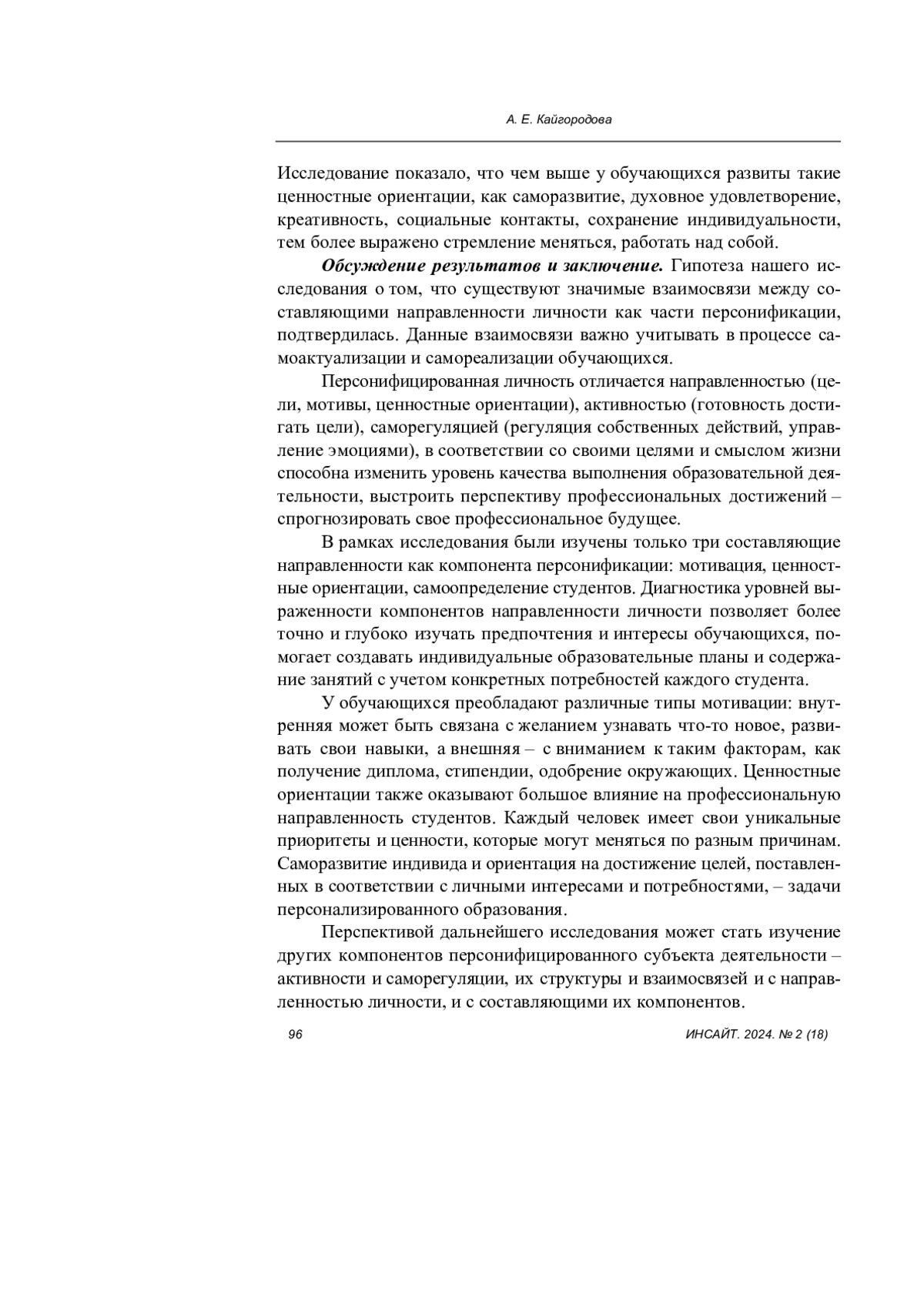 С помощью психодиагностических методик были изучены такие составляющие направленности, как мотивация, самоопределение, ценностные ориентации. Определение компонентов направленности личности позволит более точно и глубоко выявить предпочтения и интересы студентов, создать индивидуальные образовательные траектории с учетом конкретных потребностей каждого обучающегося. Полученные результаты подтверждают, что существуют значимые взаимосвязи между составляющими направленности личности как части персонификации, их необходимо учитывать в процессе самоактуализации и самореализации студентов.