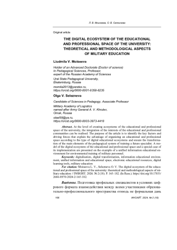 Интеграция интересов образовательного и профессионального сообществ может быть реализована на уровне создания экосистем образовательно-профессионального пространства вуза. Цель статьи - выявить ключевые факторы и движущие силы, объясняющие преимущество организации образовательно-профессионального пространства по типу цифровых образовательных экосистем и обеспечивающие трансформацию основных элементов педагогической системы подготовки будущего специалиста. Представлена модель цифровой экосистемы образовательно-профессионального пространства и частный случай ее реализации на примере единой информационной образовательной среды для экологической подготовки военнослужащих.