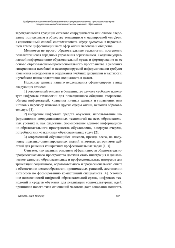 Подготовка профильных специалистов в условиях цифрового формата взаимодействия между всеми участниками образовательно-профессионального пространства отнюдь не формальная дань зарождающейся традиции сетевого сотрудничества или слепое следование популярным в обществе тенденциям с маркировкой «цифра», а единственный способ соответствовать «духу времени» в нарастающем темпе цифровизации всех сфер жизни человека и общества.