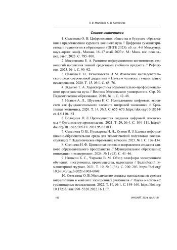 2. Московцева Е. А. Развитие информационно-когнитивных технологий получения знаний средствами учебного предмета // Рефлексия. 2023. № 1. С. 90-92. EDN: CPJKKV