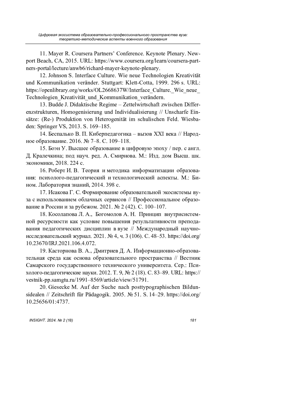 20. Giesecke M. Auf der Suche nach posttypographischen Bildunsidealen // Zeitschrift für Pädagogik. 2005. № 51. S. 14-29. https://doi.org/10.25656/01:4737.