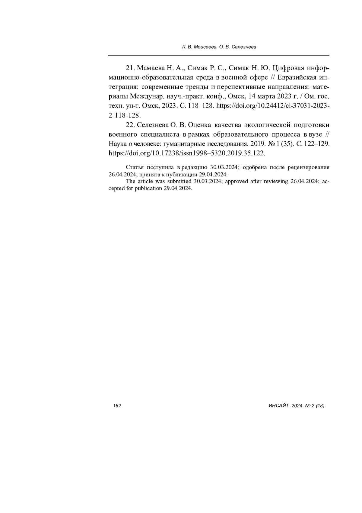 21. Мамаева Н. А., Симак Р. С., Симак Н. Ю. Цифровая информационно-образовательная среда в военной сфере // Евразийская интеграция: современные тренды и перспективные направления: материалы Междунар. науч.-практ. конф., Омск, 14 марта 2023 г. / Ом. гос. техн. ун-т. Омск, 2023. С. 118-128. DOI: 10.24412/cl-37031-2023-2-118-128 EDN: FLRSDQ