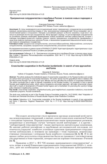 15. Себенцов А. Б. Институциональное измерение приграничного сотрудничества в российском приграничье // Региональные исследования. 2018. № 3 (61). С. 66-75. EDN: VPMQAB