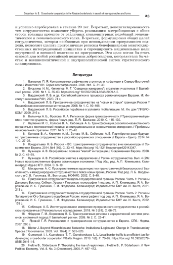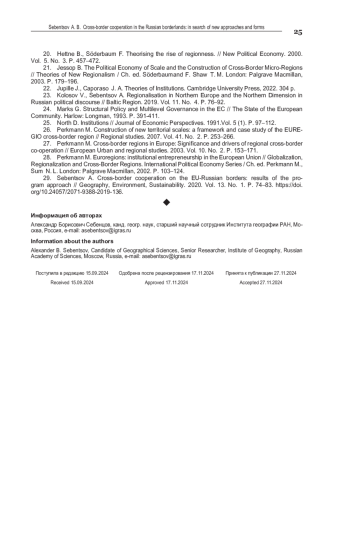 29. Sebentsov A. B. Cross-border cooperation on the EU-Russian borders: results of the program approach. // Geography, Environment, Sustainability. 2020. No. 13 (1). P. 74-83. DOI: 10.24057/2071-9388-2019-136 EDN: RJYBJJ