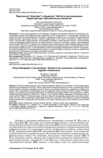 В статье рассматривается использование китайского мессенджера WeChat как механизма конструирования мигрантской инфраструктуры студентами из КНР. Показывается, что мессенджер становится не только инструментом коммуникации для китайских студентов российского вуза, но и базой для разветвлённой инфраструктуры: организации питания, торговли, развлечений, в том числе и нелегальных. Через сопоставление с результатами предшествующих исследований “китайских” рынков делается вывод о типологическом сходстве создаваемой инфраструктуры на основе WeChat и экосистем “этнических” рынков, существовавших на протяжении 1990-2010-х гг. Однако, если “китайские” рынки представляли собой конвенциональные локальности контакта с Другим в физическом пространстве города, где преимущественно и концентрировалась соответствующая инфраструктура, то использование интернет-мессенджера принципиально меняет конструкцию. Последняя формируется по распределённой модели, а точкой её сборки становится не место в физическом пространстве, а виртуальная площадка мессенджера WeChat.МИГРАНТСКАЯ ИНФРАСТРУКТУРА, КИТАЙСКИЕ СТУДЕНТЫ, МЕССЕНДЖЕР WECHAT, “КИТАЙСКИЙ” РЫНОК, МЕСТО, ЦИФРОВИЗАЦИЯ