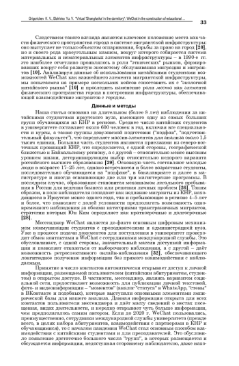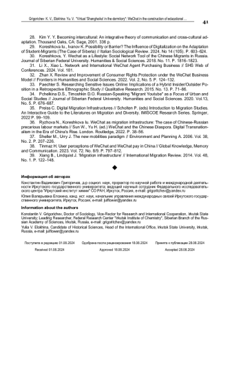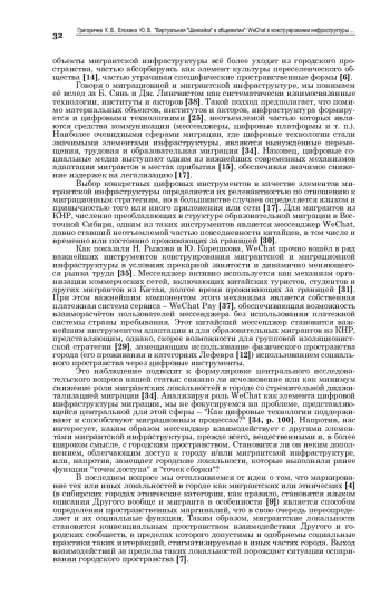 30. Koreshkova Y. Wechat as a Lifestyle: Social Network Tool of the Chinese Migrants in Russia. Journal of Siberian Federal University. Humanities & Social Sciences. 2018. No. 11. P. 1816-1823. EDN: YOLAEX