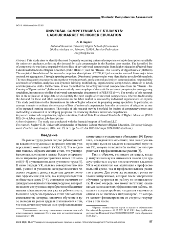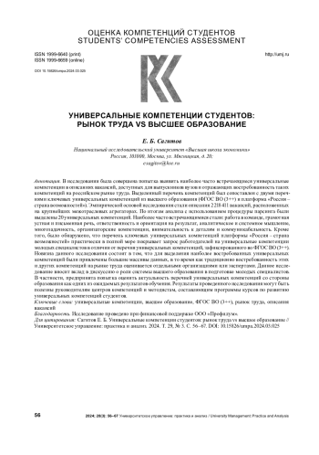 В исследовании была совершена попытка выявить наиболее часто встречающиеся универсальные компетенции в описаниях вакансий, доступных для выпускников вузов и отражающих востребованность таких компетенций на российском рынке труда. Выделенный перечень компетенций был сопоставлен с двумя перечнями ключевых универсальных компетенций из высшего образования (ФГОС ВО (3++) и платформа «Россия - страна возможностей»). Эмпирической основой исследования стали описания 2 218 411 вакансий, расположенных на крупнейших межотраслевых агрегаторах. По итогам анализа с использованием процедуры парсинга были выделены 20 универсальных компетенций. Наиболее часто встречающимися стали: работа в команде, грамотная устная и письменная речь, ответственность и ориентация на результат, аналитическое и системное мышление, многозадачность, организаторские компетенции, внимательность к деталям и коммуникабельность. Кроме того, было обнаружено, что перечень ключевых универсальных компетенций платформы «Россия - страна возможностей» практически в полной мере покрывает запрос работодателей на универсальные компетенции молодых специалистов в отличии от перечня универсальных компетенций, зафиксированного во ФГОС ВО (3++). Новизна данного исследования состоит в том, что для выделения наиболее востребованных универсальных компетенций были привлечены большие массивы данных, в то время как традиционно востребованность этих и других компетенций на рынке труда оценивается отдельными организациями или экспертами. Данное исследование вносит вклад в дискуссию о роли системы высшего образования в подготовке молодых специалистов. В частности, предпринята попытка оценить актуальность перечней универсальных компетенций со стороны образования как одних из ожидаемых результатов обучения. Результаты проведенного исследования могут быть полезны руководителям центров компетенций и методистам, составляющим программы курсов по развитию универсальных компетенций студентов.