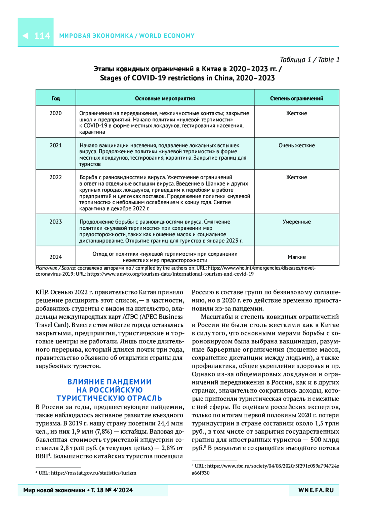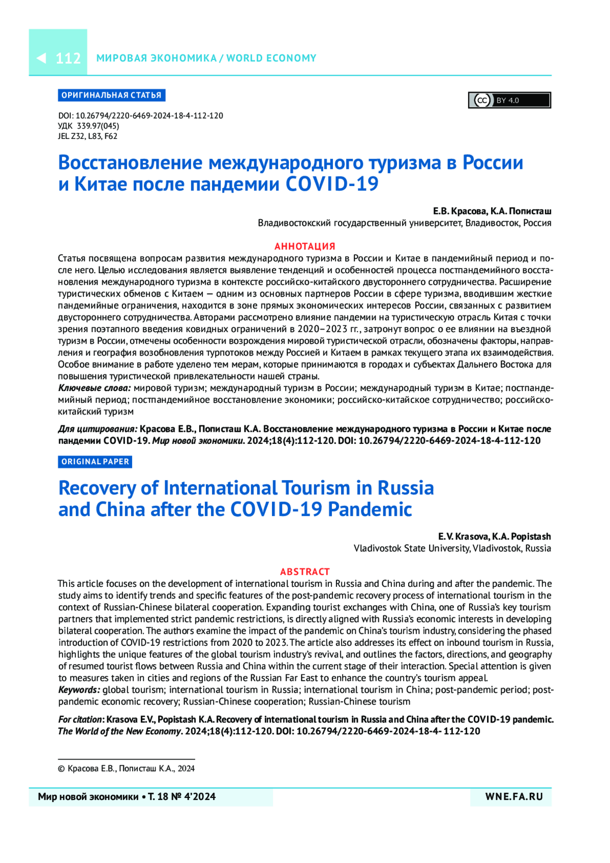 Расширение туристических обменов с Китаем — одним из основных партнеров России в сфере туризма, вводившим жесткие пандемийные ограничения, – находится в зоне прямых экономических интересов России, связанных с развитием двустороннего сотрудничества. Авторами рассмотрено влияние пандемии на туристическую отрасль Китая с точки зрения поэтапного введения ковидных ограничений в 2020–2023 гг., затронут вопрос о ее влиянии на въездной туризм в России, отмечены особенности возрождения мировой туристической отрасли, обозначены факторы, направления и география возобновления турпотоков между Россией и Китаем в рамках текущего этапа их взаимодействия. Особое внимание в работе уделено тем мерам, которые принимаются в городах и субъектах Дальнего Востока для повышения туристической привлекательности нашей страны.