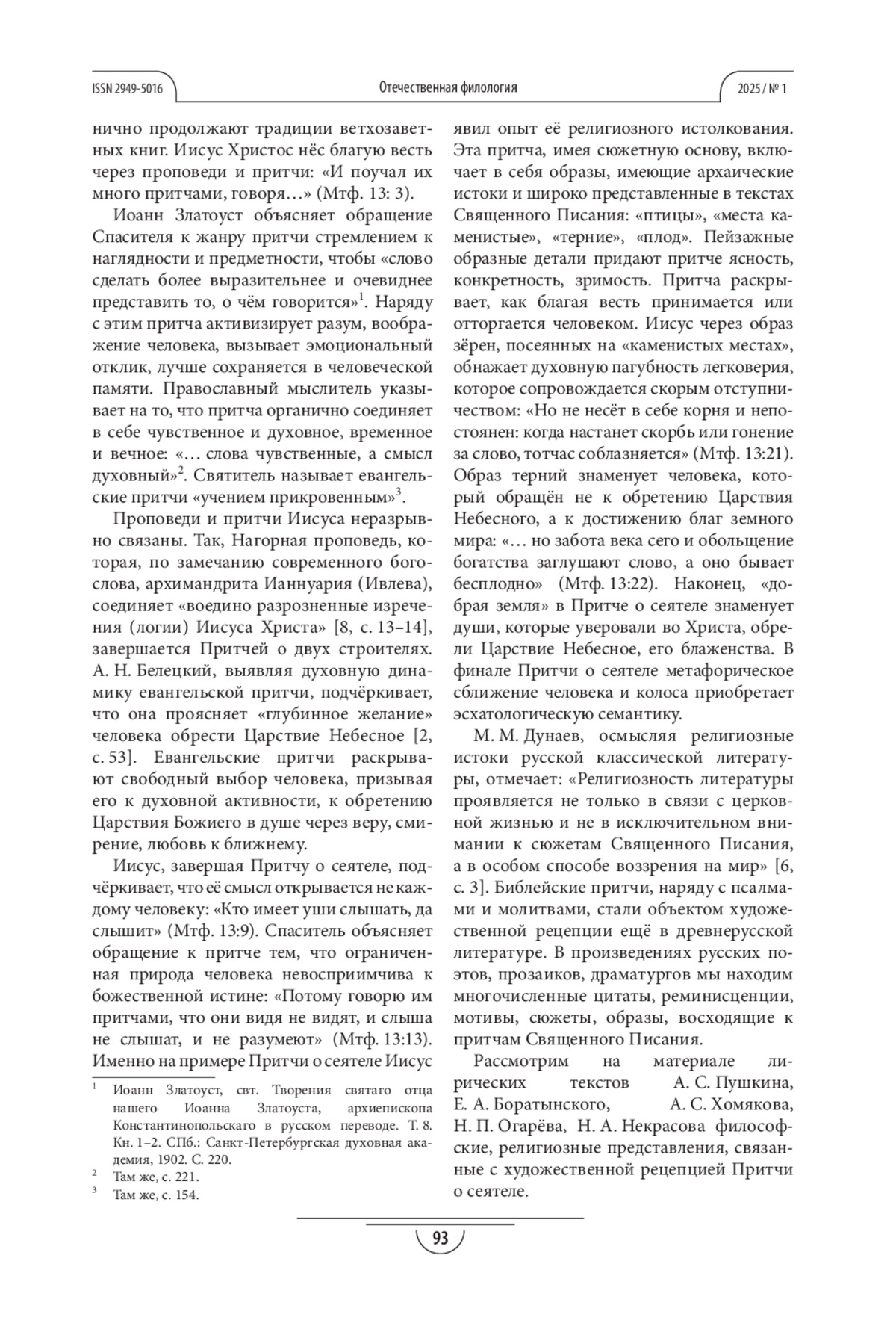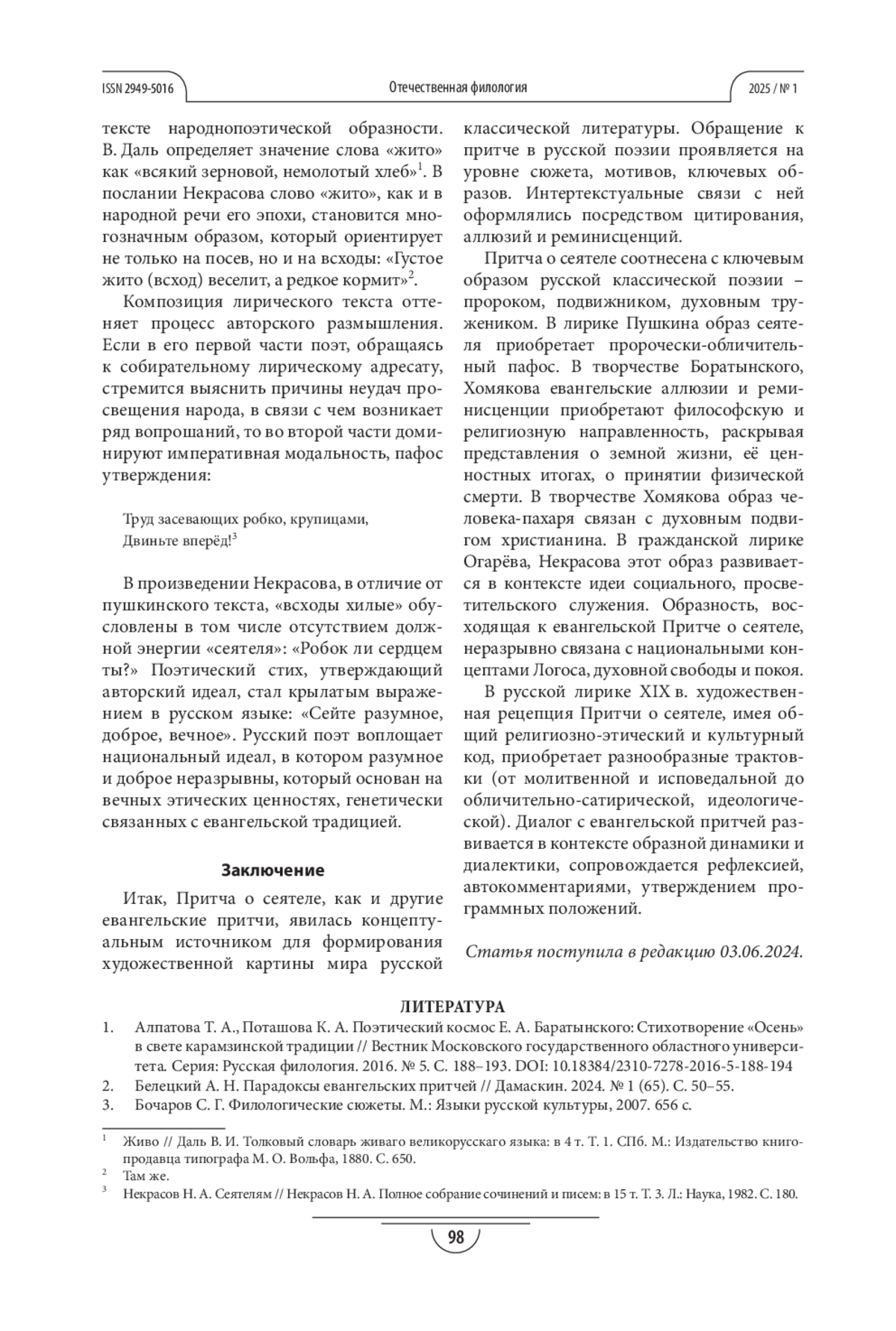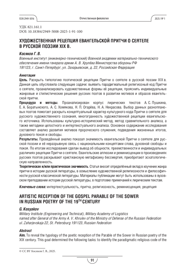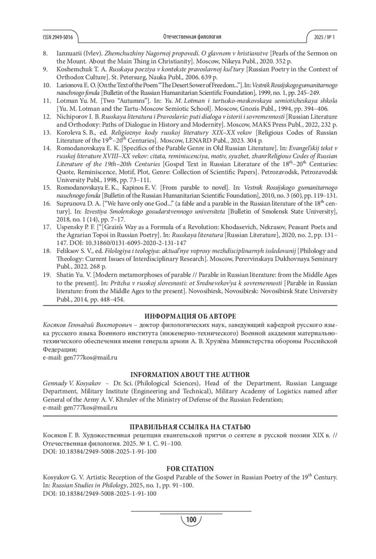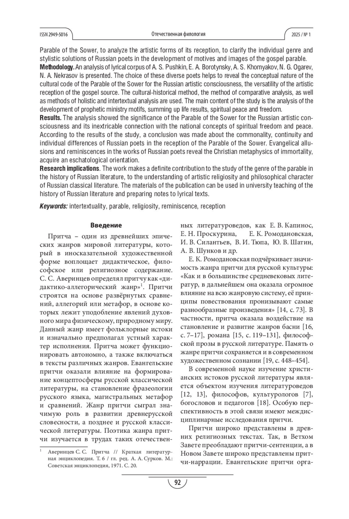 Результаты. Проведённый анализ показал значимость евангельской Притчи о сеятеле для русской поэзии и её неразрывную связь с национальными концептами слова, духовной свободы и покоя. По итогам исследования сделан вывод об общности, преемственности и индивидуальных различиях рецепции Притчи о сеятеле. Евангельские аллюзии и реминисценции в произведениях русских поэтов раскрывают христианскую метафизику бессмертия, приобретают эсхатологическую направленность.