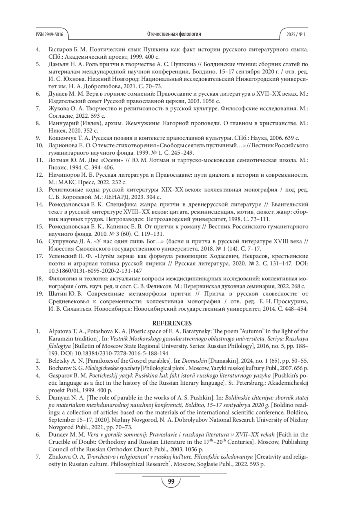 5. Дамьян Н. А. Роль притчи в творчестве А. С. Пушкина // Болдинские чтения: сборник статей по материалам международной научной конференции, Болдино, 15-17 сентября 2020 г. / отв. ред. И. С. Юхнова. Нижний Новгород: Национальный исследовательский Нижегородский университет им. Н. А. Добролюбова, 2021. С. 70-73.